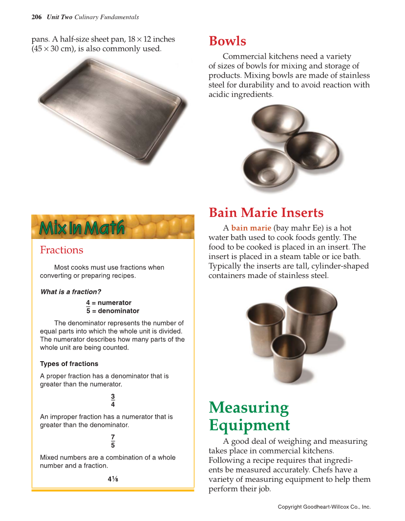 206 Unit Two Culinary Fundamentals Copyright Goodheart-Willcox Co., Inc. Measuring Equipment A good deal of weighing and measuring takes place in commercial kitchens. Following a recipe requires that ingredi- ents be measured accurately. Chefs have a variety of measuring equipment to help them perform their job. Bowls Commercial kitchens need a variety of sizes of bowls for mixing and storage of products. Mixing bowls are made of stainless steel for durability and to avoid reaction with acidic ingredients. Bain Marie Inserts A bain marie (bay mahr Ee) is a hot water bath used to cook foods gently. The food to be cooked is placed in an insert. The insert is placed in a steam table or ice bath. Typically the inserts are tall, cylinder-shaped containers made of stainless steel. Fractions Most cooks must use fractions when converting or preparing recipes. What is a fraction? 4 = numerator 5 = denominator The denominator represents the number of equal parts into which the whole unit is divided. The numerator describes how many parts of the whole unit are being counted. Types of fractions A proper fraction has a denominator that is greater than the numerator. 3 4 An improper fraction has a numerator that is greater than the denominator. 7 5 Mixed numbers are a combination of a whole number and a fraction. 41⁄8 M i x I n M a t h pans. A half-size sheet pan, 18 × 12 inches (45 × 30 cm), is also commonly used.