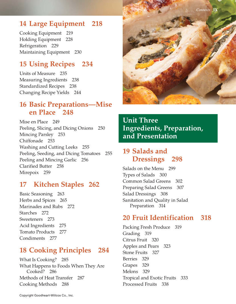 Contents IX Copyright Goodheart-Willcox Co., Inc. 14 Large Equipment 218 Cooking Equipment 219 Holding Equipment 228 Refrigeration 229 Maintaining Equipment 230 15 Using Recipes 234 Units of Measure 235 Measuring Ingredients 238 Standardized Recipes 238 Changing Recipe Yields 244 16 Basic Preparations—Mise en Place 248 Mise en Place 249 Peeling, Slicing, and Dicing Onions 250 Mincing Parsley 253 Chiffonade 253 Washing and Cutting Leeks 255 Peeling, Seeding, and Dicing Tomatoes 255 Peeling and Mincing Garlic 256 Clarified Butter 258 Mirepoix 259 17 Kitchen Staples 262 Basic Seasoning 263 Herbs and Spices 265 Marinades and Rubs 272 Starches 272 Sweeteners 273 Acid Ingredients 275 Tomato Products 277 Condiments 277 18 Cooking Principles 284 What Is Cooking? 285 What Happens to Foods When They Are Cooked? 286 Methods of Heat Transfer 287 Cooking Methods 288 Unit Three Ingredients, Preparation, and Presentation 19 Salads and Dressings 298 Salads on the Menu 299 Types of Salads 300 Common Salad Greens 302 Preparing Salad Greens 307 Salad Dressings 308 Sanitation and Quality in Salad Preparation 314 20 Fruit Identification 318 Packing Fresh Produce 319 Grading 319 Citrus Fruit 320 Apples and Pears 323 Stone Fruits 327 Berries 329 Grapes 329 Melons 329 Tropical and Exotic Fruits 333 Processed Fruits 338