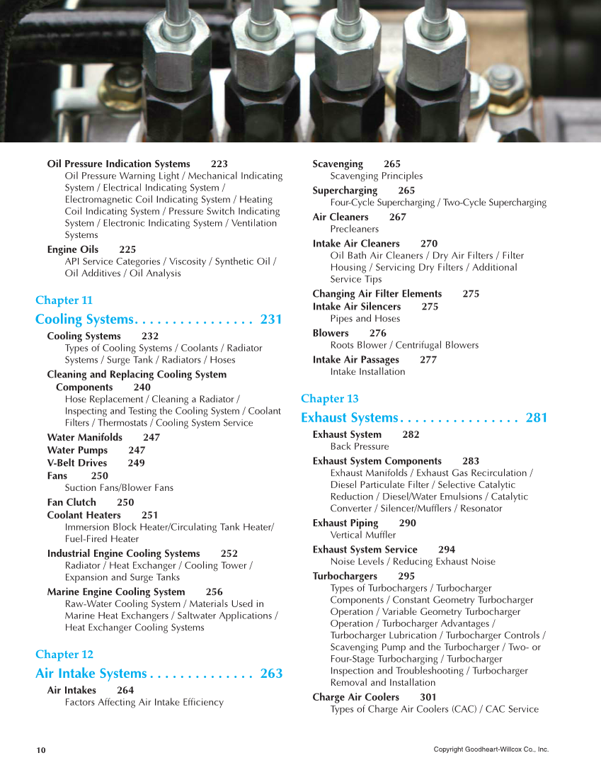 Copyright Goodheart-Willcox Co., Inc. 10 Oil Pressure Indication Systems 223 Oil Pressure Warning Light / Mechanical Indicating System / Electrical Indicating System / Electromagnetic Coil Indicating System / Heating Coil Indicating System / Pressure Switch Indicating System / Electronic Indicating System / Ventilation Systems Engine Oils 225 API Service Categories / Viscosity / Synthetic Oil / Oil Additives / Oil Analysis Chapter 11 Cooling Systems . . . . . . . . . . . . . . . . 231 Cooling Systems 232 Types of Cooling Systems / Coolants / Radiator Systems / Surge Tank / Radiators / Hoses Cleaning and Replacing Cooling System Components 240 Hose Replacement / Cleaning a Radiator / Inspecting and Testing the Cooling System / Coolant Filters / Thermostats / Cooling System Service Water Manifolds 247 Water Pumps 247 V-Belt Drives 249 Fans 250 Suction Fans/Blower Fans Fan Clutch 250 Coolant Heaters 251 Immersion Block Heater/Circulating Tank Heater/ Fuel-Fired Heater Industrial Engine Cooling Systems 252 Radiator / Heat Exchanger / Cooling Tower / Expansion and Surge Tanks Marine Engine Cooling System 256 Raw-Water Cooling System / Materials Used in Marine Heat Exchangers / Saltwater Applications / Heat Exchanger Cooling Systems Chapter 12 Air Intake Systems . . . . . . . . . . . . . . 263 Air Intakes 264 Factors Affecting Air Intake Efficiency Scavenging 265 Scavenging Principles Supercharging 265 Four-Cycle Supercharging / Two-Cycle Supercharging Air Cleaners 267 Precleaners Intake Air Cleaners 270 Oil Bath Air Cleaners / Dry Air Filters / Filter Housing / Servicing Dry Filters / Additional Service Tips Changing Air Filter Elements 275 Intake Air Silencers 275 Pipes and Hoses Blowers 276 Roots Blower / Centrifugal Blowers Intake Air Passages 277 Intake Installation Chapter 13 Exhaust Systems . . . . . . . . . . . . . . . . 281 Exhaust System 282 Back Pressure Exhaust System Components 283 Exhaust Manifolds / Exhaust Gas Recirculation / Diesel Particulate Filter / Selective Catalytic Reduction / Diesel/Water Emulsions / Catalytic Converter / Silencer/Mufflers / Resonator Exhaust Piping 290 Vertical Muffler Exhaust System Service 294 Noise Levels / Reducing Exhaust Noise Turbochargers 295 Types of Turbochargers / Turbocharger Components / Constant Geometry Turbocharger Operation / Variable Geometry Turbocharger Operation / Turbocharger Advantages / Turbocharger Lubrication / Turbocharger Controls / Scavenging Pump and the Turbocharger / Two- or Four-Stage Turbocharging / Turbocharger Inspection and Troubleshooting / Turbocharger Removal and Installation Charge Air Coolers 301 Types of Charge Air Coolers (CAC) / CAC Service