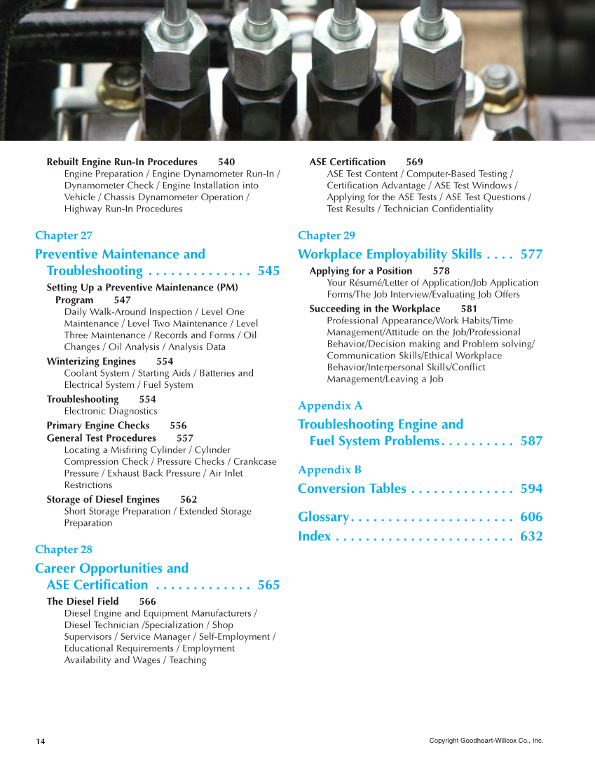 Copyright Goodheart-Willcox Co., Inc. 14 Rebuilt Engine Run-In Procedures 540 Engine Preparation / Engine Dynamometer Run-In / Dynamometer Check / Engine Installation into Vehicle / Chassis Dynamometer Operation / Highway Run-In Procedures Chapter 27 Preventive Maintenance and Troubleshooting . . . . . . . . . . . . . . 545 Setting Up a Preventive Maintenance (PM) Program 547 Daily Walk-Around Inspection / Level One Maintenance / Level Two Maintenance / Level Three Maintenance / Records and Forms / Oil Changes / Oil Analysis / Analysis Data Winterizing Engines 554 Coolant System / Starting Aids / Batteries and Electrical System / Fuel System Troubleshooting 554 Electronic Diagnostics Primary Engine Checks 556 General Test Procedures 557 Locating a Misfiring Cylinder / Cylinder Compression Check / Pressure Checks / Crankcase Pressure / Exhaust Back Pressure / Air Inlet Restrictions Storage of Diesel Engines 562 Short Storage Preparation / Extended Storage Preparation Chapter 28 Career Opportunities and ASE Certification . . . . . . . . . . . . . 565 The Diesel Field 566 Diesel Engine and Equipment Manufacturers / Diesel Technician /Specialization / Shop Supervisors / Service Manager / Self-Employment / Educational Requirements / Employment Availability and Wages / Teaching ASE Certification 569 ASE Test Content / Computer-Based Testing / Certification Advantage / ASE Test Windows / Applying for the ASE Tests / ASE Test Questions / Test Results / Technician Confidentiality Chapter 29 Workplace Employability Skills . . . . 577 Applying for a Position 578 Your Résumé/Letter of Application/Job Application Forms/The Job Interview/Evaluating Job Offers Succeeding in the Workplace 581 Professional Appearance/Work Habits/Time Management/Attitude on the Job/Professional Behavior/Decision making and Problem solving/ Communication Skills/Ethical Workplace Behavior/Interpersonal Skills/Conflict Management/Leaving a Job Appendix A Troubleshooting Engine and Fuel System Problems . . . . . . . . . . 587 Appendix B Conversion Tables . . . . . . . . . . . . . . 594 Glossary . . . . . . . . . . . . . . . . . . . . . . 606 Index . . . . . . . . . . . . . . . . . . . . . . . . 632