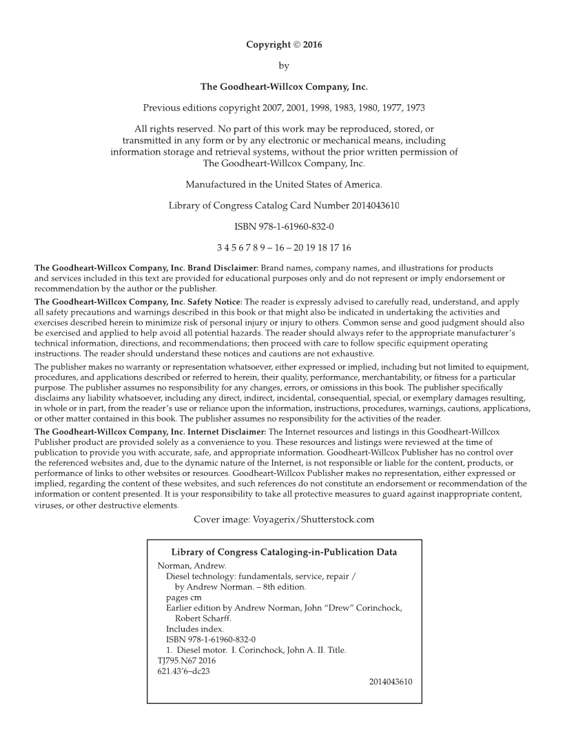 Copyright © 2016 by The Goodheart-Willcox Company, Inc. Previous editions copyright 2007, 2001, 1998, 1983, 1980, 1977, 1973 All rights reserved. No part of this work may be reproduced, stored, or transmitted in any form or by any electronic or mechanical means, including information storage and retrieval systems, without the prior written permission of The Goodheart-Willcox Company, Inc. Manufactured in the United States of America. Library of Congress Catalog Card Number 2014043610 ISBN 978-1-61960-832-0 3 4 5 6 7 8 9 – 16 – 20 19 18 17 16 The Goodheart-Willcox Company, Inc. Brand Disclaimer: Brand names, company names, and illustrations for products and services included in this text are provided for educational purposes only and do not represent or imply endorsement or recommendation by the author or the publisher. The Goodheart-Willcox Company, Inc. Safety Notice: The reader is expressly advised to carefully read, understand, and apply all safety precautions and warnings described in this book or that might also be indicated in undertaking the activities and exercises described herein to minimize risk of personal injury or injury to others. Common sense and good judgment should also be exercised and applied to help avoid all potential hazards. The reader should always refer to the appropriate manufacturer’s technical information, directions, and recommendations then proceed with care to follow specifi equipment operating fic instructions. The reader should understand these notices and cautions are not exhaustive. The publisher makes no warranty or representation whatsoever, either expressed or implied, including but not limited to equipment, procedures, and applications described or referred to herein, their quality, performance, merchantability, or fitness for a particular fi purpose. The publisher assumes no responsibility for any changes, errors, or omissions in this book. The publisher specifi fically disclaims any liability whatsoever, including any direct, indirect, incidental, consequential, special, or exemplary damages resulting, in whole or in part, from the reader’s use or reliance upon the information, instructions, procedures, warnings, cautions, applications, or other matter contained in this book. The publisher assumes no responsibility for the activities of the reader. The Goodheart-Willcox Company, Inc. Internet Disclaimer: The Internet resources and listings in this Goodheart-Willcox Publisher product are provided solely as a convenience to you. These resources and listings were reviewed at the time of publication to provide you with accurate, safe, and appropriate information. Goodheart-Willcox Publisher has no control over the referenced websites and, due to the dynamic nature of the Internet, is not responsible or liable for the content, products, or performance of links to other websites or resources. Goodheart-Willcox Publisher makes no representation, either expressed or implied, regarding the content of these websites, and such references do not constitute an endorsement or recommendation of the information or content presented. It is your responsibility to take all protective measures to guard against inappropriate content, viruses, or other destructive elements. Cover image: Voyagerix/Shutterstock.com Library of Congress Cataloging-in-Publication Data Norman, Andrew. Diesel technology: fundamentals, service, repair / by Andrew Norman. – 8th edition. pages cm Earlier edition by Andrew Norman, John “Drew” Corinchock, Robert Scharff. Includes index. ISBN 978-1-61960-832-0 1. Diesel motor. I. Corinchock, John A. II. Title. TJ795.N67 2016 621.43’6–dc23 2014043610