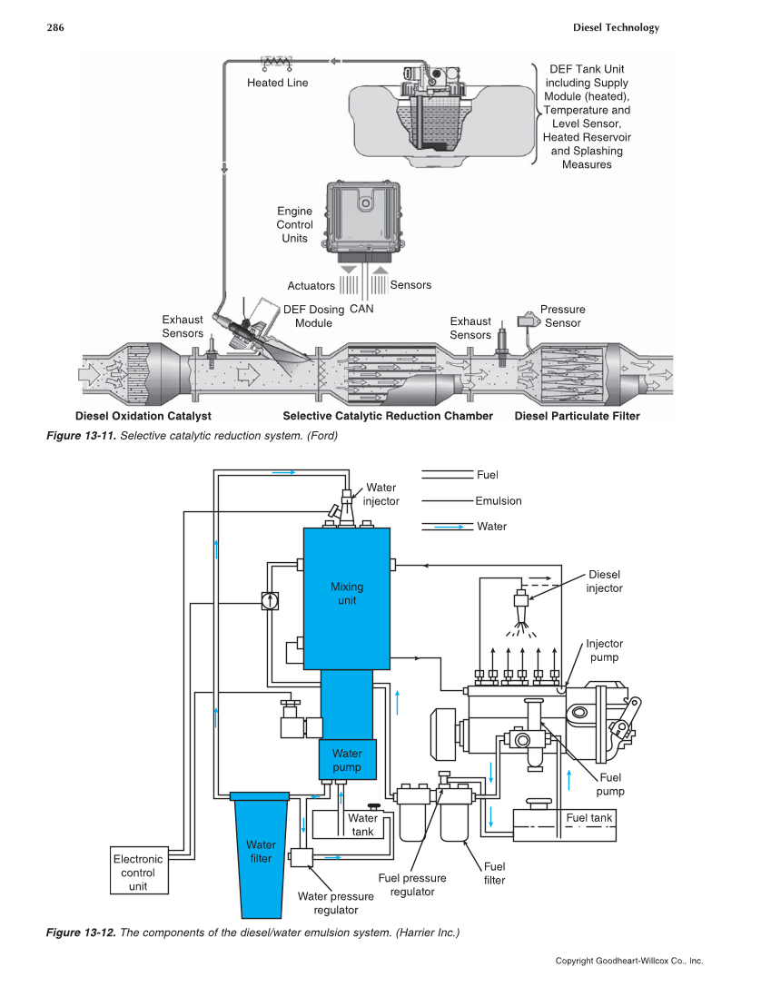 286 Diesel Technology Copyright Goodheart-Willcox Co., Inc. Fuel Emulsion Water Diesel injector Injector pump Fuel pump Fuel tank Fuel filter Fuel pressure regulator Water pressure regulator Electronic control unit Water filter Water pump Water tank Mixing unit Water injector Figure 13-12. The components of the diesel/water emulsion system. (Harrier Inc.) Heated Line DEF Tank Unit including Supply Module (heated), Temperature and Level Sensor, Heated Reservoir and Splashing Measures Engine Control Units Exhaust Sensors Exhaust Sensors Diesel Oxidation Catalyst Diesel Particulate Filter Selective Catalytic Reduction Chamber DEF Dosing Module CAN Pressure Sensor Actuators Sensors Figure 13-11. Selective catalytic reduction system. (Ford)