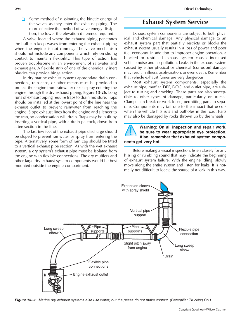 294 Diesel Technology Copyright Goodheart-Willcox Co., Inc. ❑ Some method of dissipating the kinetic energy of the waves as they enter the exhaust piping. The more effective the method of wave energy dissipa- tion, the lower the elevation difference required. A valve located where the exhaust piping penetrates the hull can keep waves from entering the exhaust piping when the engine is not running. The valve mechanism should not include any components which rely on sliding contact to maintain flexibility. This type of action has proven troublesome in an environment of saltwater and exhaust gas. A flexible strip of one of the chemically inert plastics can provide hinge action. In dry marine exhaust systems appropriate drain con- nections, rain caps, or other means must be provided to protect the engine from rainwater or sea spray entering the engine through the dry exhaust piping, Figure 13-26. Long runs of exhaust piping require traps to drain moisture. Traps should be installed at the lowest point of the line near the exhaust outlet to prevent rainwater from reaching the engine. Slope exhaust lines from the engine and silencer to the trap, so condensation will drain. Traps may be built by inserting a vertical pipe, with a drain petcock, down from a tee section in the line. The last few feet of the exhaust pipe discharge should be sloped to prevent rainwater or spray from entering the pipe. Alternatively, some form of rain cap should be fitted to a vertical exhaust pipe section. As with the wet exhaust system, a dry system’s exhaust pipe must be isolated from the engine with flexible connections. The dry mufflers and other large dry exhaust system components would be best mounted outside the engine compartment. Exhaust System Service Exhaust system components are subject to both phys- ical and chemical damage. Any physical damage to an exhaust system part that partially restricts or blocks the exhaust system usually results in a loss of power and poor fuel economy. In addition to improper engine operation, a blocked or restricted exhaust system causes increased vehicle noise and air pollution. Leaks in the exhaust system caused by either physical or chemical (corrosion) damage may result in illness, asphyxiation, or even death. Remember that vehicle exhaust fumes are very dangerous. Most exhaust system components, especially the exhaust pipe, muffler, DPF, DOC, and outlet pipe, are sub- ject to rusting and cracking. These parts are also suscep- tible to other types of damage, particularly on trucks. Clamps can break or work loose, permitting parts to sepa- rate. Components may fail due to the impact that occurs when the vehicle hits ruts and potholes in the road. Parts may also be damaged by rocks thrown up by the wheels. Warning: On all inspection and repair work, be sure to wear appropriate eye protection. Also, remember that exhaust system compo- nents get very hot. Before making a visual inspection, listen closely for any hissing or rumbling sound that may indicate the beginning of exhaust system failure. With the engine idling, slowly move along the entire system and listen for leaks. It is nor- mally not difficult to locate the source of a leak in this way. Expansion sleeve with spray shield Vertical pipe support Flexible pipe connection Flexible pipe connections Long sweep elbow Drain Slight pitch away from engine Pipe supports Pipe supports Engine exhaust outlet Long sweep elbow Figure 13-26. Marine dry exhaust systems also use water, but the gases do not make contact. (Caterpillar Trucking Co.)