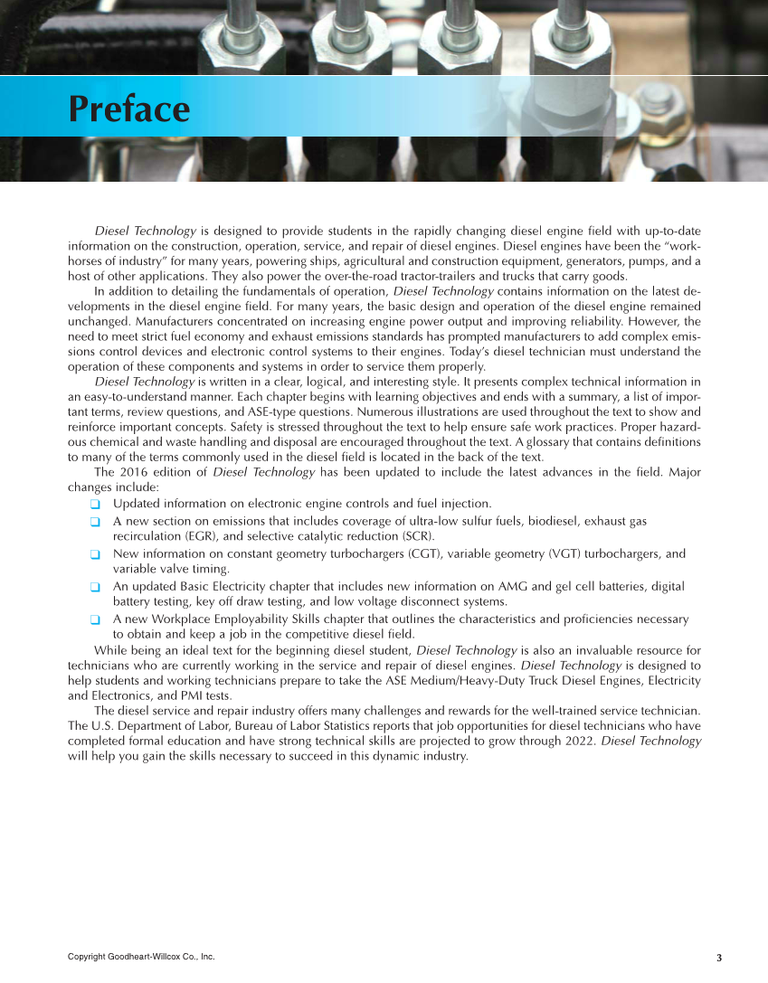 Copyright Goodheart-Willcox Co., Inc. 3 Diesel Technology is designed to provide students in the rapidly changing diesel engine fi eld with up-to-date information on the construction, operation, service, and repair of diesel engines. Diesel engines have been the “work- horses of industry” for many years, powering ships, agricultural and construction equipment, generators, pumps, and a host of other applications. They also power the over-the-road tractor-trailers and trucks that carry goods. In addition to detailing the fundamentals of operation, Diesel Technology contains information on the latest de- velopments in the diesel engine fi eld. For many years, the basic design and operation of the diesel engine remained unchanged. Manufacturers concentrated on increasing engine power output and improving reliability. However, the need to meet strict fuel economy and exhaust emissions standards has prompted manufacturers to add complex emis- sions control devices and electronic control systems to their engines. Today’s diesel technician must understand the operation of these components and systems in order to service them properly. Diesel Technology is written in a clear, logical, and interesting style. It presents complex technical information in an easy-to-understand manner. Each chapter begins with learning objectives and ends with a summary, a list of impor- tant terms, review questions, and ASE-type questions. Numerous illustrations are used throughout the text to show and reinforce important concepts. Safety is stressed throughout the text to help ensure safe work practices. Proper hazard- ous chemical and waste handling and disposal are encouraged throughout the text. A glossary that contains defi nitions to many of the terms commonly used in the diesel fi eld is located in the back of the text. The 2016 edition of Diesel Technology has been updated to include the latest advances in the fi eld. Major changes include: ❑ Updated information on electronic engine controls and fuel injection. ❑ Α new section on emissions that includes coverage of ultra-low sulfur fuels, biodiesel, exhaust gas recirculation (EGR), and selective catalytic reduction (SCR). ❑ New information on constant geometry turbochargers (CGT), variable geometry (VGT) turbochargers, and variable valve timing. ❑ An updated Basic Electricity chapter that includes new information on AMG and gel cell batteries, digital battery testing, key off draw testing, and low voltage disconnect systems. ❑ A new Workplace Employability Skills chapter that outlines the characteristics and proficiencies necessary to obtain and keep a job in the competitive diesel field. While being an ideal text for the beginning diesel student, Diesel Technology is also an invaluable resource for technicians who are currently working in the service and repair of diesel engines. Diesel Technology is designed to help students and working technicians prepare to take the ASE Medium/Heavy-Duty Truck Diesel Engines, Electricity and Electronics, and PMI tests. The diesel service and repair industry offers many challenges and rewards for the well-trained service technician. The U.S. Department of Labor, Bureau of Labor Statistics reports that job opportunities for diesel technicians who have completed formal education and have strong technical skills are projected to grow through 2022. Diesel Technology will help you gain the skills necessary to succeed in this dynamic industry. Preface