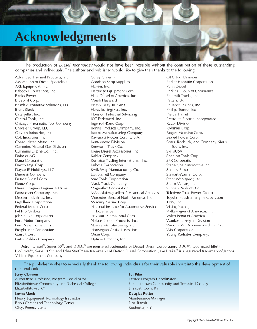 Copyright Goodheart-Willcox Co., Inc. 6 Advanced Thermal Products, Inc. Association of Diesel Specialists AXE Equipment, Inc. Babcox Publications, Inc. Banks Power Bluebird Corp. Bosch Automotive Solutions, LLC Brent Black Caterpillar, Inc. Central Tools, Inc. Chicago Pneumatic Tool Company Chrysler Group, LLC Clayton Industries, Inc. Colt Industries, Inc. Consolidated Metro, Inc. Cummins Natural Gas Division Cummins Engine Co., Inc. Daimler AG Dana Corporation Davco Mfg. Corp. Dayco IP Holdings, LLC Deere & Company Detroit Diesel Corp. Deutz Corp. Diesel Progress Engines & Drives Donaldson Company, Inc. Dresser Industries, Inc. Engelhard Corporation Federal Mogul Corp. Fel-Pro Gaskets John Fluke Corporation Ford Motor Company Ford New Holland, Inc. Freightliner Corporation Garrett Corp. Gates Rubber Company Corey Glassman Goodson Shop Supplies Harrier, Inc. Hartridge Equipment Corp. Hatz Diesel of America, Inc. Marsh Hayward Heavy Duty Trucking Hercules Engines, Inc. Houston Industrial Silencing ICC Federated, Inc. Ingersoll-Rand Corp. Ironite Products Company, Inc. Jacobs Manufacturing Company Kawasaki Motors Corp. U.S.A. Kent-Moore Division Kenworth Truck Co. Kiene Diesel Accessories, Inc. Kohler Company Komatsu Trading International, Inc. Kubota Corporation Kwik-Way Manufacturing Co. L.S. Starrett Company Mac Tools Corporation Mack Truck Company Magnafl ex Corporation MAN Aktiengesellchaft Historical Archives Mercedes Benz of North America, Inc. Mercury Marine Corp. National Institute for Automotive Service Excellence Navistar International Corp. Nelson Global Products, Inc. Neway Manufacturing, Inc. Norwegian Cruise Lines, Inc. Onan Corp. Optima Batteries, Inc. OTC Tool Division Parker Hannifi n Corporation Penn Diesel Perkins Group of Companies Peterbilt Trucks, Inc. Petters, Ltd. Peugeot Engines, Inc. Philips Temro, Inc. Pierce Transit Prestolite Electric Incorporated Racor Division Robinair Corp. Rogers Machine Corp. Sealed Power Corp. Sears, Roebuck, and Company, Sioux Tools, Inc. SkillsUSA Snap-on Tools Corp. SPX Corporation Stanadyne Automotive Inc. Stanley Proto Stewart-Warner Corp. Stork-Werkspoor, Ltd. Storm Vulcan, Inc. Sunnen Products Co. Teledyne Total Power Group Toyota Industrial Engine Operation TRW, Inc. Viking Yachts, Inc. Volkswagen of Americas, Inc. Volvo Penta of America Waukesha Engine Division Winona Van Norman Machine Co. Wix Corporation Young Radiator Company. Detroit Diesel®, Series 60®, and DDEC® are registered trademarks of Detroit Diesel Corporation. DDC™, Optimized Idle™, ProDrive™, Series 92™, and Ether Start™ are trademarks of Detroit Diesel Corporation. Jake Brake® is a registered trademark of Jacobs Vehicle Equipment Company. Jerry Clemons Auto/Diesel Professor, Program Coordinator Elizabethtown Community and Technical College Elizabethtown, KY James Mack Heavy Equipment Technology Instructor Berks Career and Technology Center Oley, Pennsylvania The production of Diesel Technology would not have been possible without the contribution of these outstanding companies and individuals. The authors and publisher would like to give their thanks to the following: Les Pike Retired Program Coordinator Elizabethtown Community and Technical College Elizabethtown, KY Douglas Potter Maintenance Manager First Transit Rochester, NY The publisher wishes to especially thank the following individuals for their valuable input into the development of this textbook. Acknowledgments