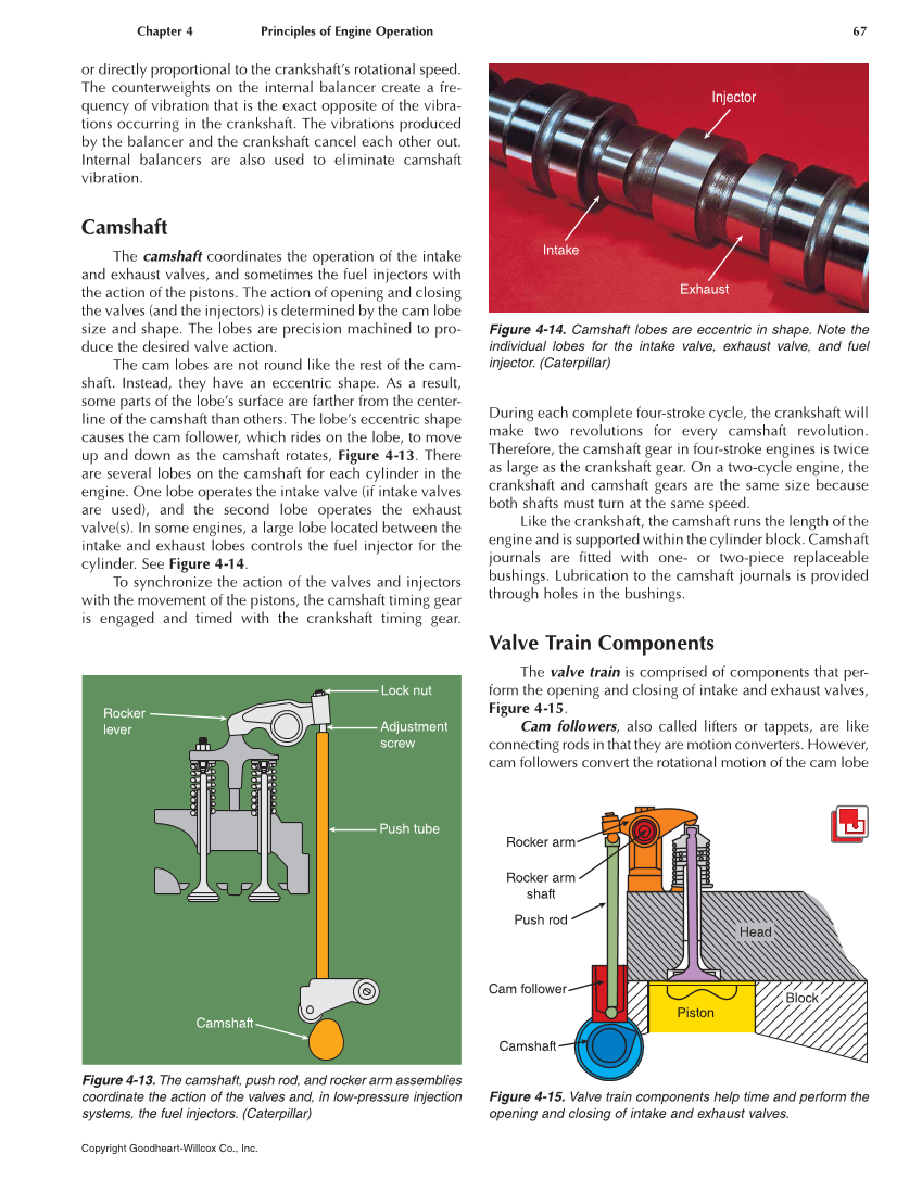 Chapter 4 Principles of Engine Operation 67 Copyright Goodheart-Willcox Co., Inc. or directly proportional to the crankshaft’s rotational speed. The counterweights on the internal balancer create a fre- quency of vibration that is the exact opposite of the vibra- tions occurring in the crankshaft. The vibrations produced by the balancer and the crankshaft cancel each other out. Internal balancers are also used to eliminate camshaft vibration. Camshaft The camshaft coordinates the operation of the intake and exhaust valves, and sometimes the fuel injectors with the action of the pistons. The action of opening and closing the valves (and the injectors) is determined by the cam lobe size and shape. The lobes are precision machined to pro- duce the desired valve action. The cam lobes are not round like the rest of the cam- shaft. Instead, they have an eccentric shape. As a result, some parts of the lobe’s surface are farther from the center- line of the camshaft than others. The lobe’s eccentric shape causes the cam follower, which rides on the lobe, to move up and down as the camshaft rotates, Figure 4-13. There are several lobes on the camshaft for each cylinder in the engine. One lobe operates the intake valve (if intake valves are used), and the second lobe operates the exhaust valve(s). In some engines, a large lobe located between the intake and exhaust lobes controls the fuel injector for the cylinder. See Figure 4-14. To synchronize the action of the valves and injectors with the movement of the pistons, the camshaft timing gear is engaged and timed with the crankshaft timing gear. During each complete four-stroke cycle, the crankshaft will make two revolutions for every camshaft revolution. Therefore, the camshaft gear in four-stroke engines is twice as large as the crankshaft gear. On a two-cycle engine, the crankshaft and camshaft gears are the same size because both shafts must turn at the same speed. Like the crankshaft, the camshaft runs the length of the engine and is supported within the cylinder block. Camshaft journals are fitted with one- or two-piece replaceable bushings. Lubrication to the camshaft journals is provided through holes in the bushings. Valve Train Components The valve train is comprised of components that per- form the opening and closing of intake and exhaust valves, Figure 4-15. Cam followers, also called lifters or tappets, are like connecting rods in that they are motion converters. However, cam followers convert the rotational motion of the cam lobe Lock nut Adjustment screw Push tube Rocker lever Camshaft Figure 4-13. The camshaft, push rod, and rocker arm assemblies coordinate the action of the valves and, in low-pressure injection systems, the fuel injectors. (Caterpillar) Injector Exhaust Intake Figure 4-14. Camshaft lobes are eccentric in shape. Note the individual lobes for the intake valve, exhaust valve, and fuel injector. (Caterpillar) Rocker arm Rocker arm shaft Push rod Cam follower Camshaft Head Piston Block Figure 4-15. Valve train components help time and perform the opening and closing of intake and exhaust valves.