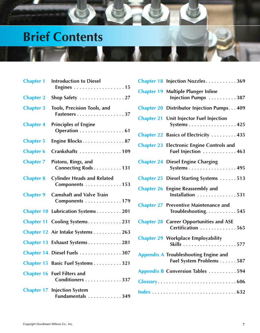 Copyright Goodheart-Willcox Co., Inc. 7 Brief Contents Chapter 1 Introduction to Diesel Engines . . . . . . . . . . . . . . . . . . 15 Chapter 2 Shop Safety . . . . . . . . . . . . . . . . 27 Chapter 3 Tools, Precision Tools, and Fasteners . . . . . . . . . . . . . . . . . 37 Chapter 4 Principles of Engine Operation . . . . . . . . . . . . . . . . 61 Chapter 5 Engine Blocks . . . . . . . . . . . . . . . 87 Chapter 6 Crankshafts . . . . . . . . . . . . . . . 109 Chapter 7 Pistons, Rings, and Connecting Rods . . . . . . . . . . 131 Chapter 8 Cylinder Heads and Related Components . . . . . . . . . . . . . 153 Chapter 9 Camshaft and Valve Train Components . . . . . . . . . . . . . 179 Chapter 10 Lubrication Systems . . . . . . . . . 201 Chapter 11 Cooling Systems . . . . . . . . . . . . 231 Chapter 12 Air Intake Systems . . . . . . . . . . 263 Chapter 13 Exhaust Systems . . . . . . . . . . . . 281 Chapter 14. Diesel Fuels . . . . . . . . . . . . . . . 307 Chapter 15 Basic Fuel Systems . . . . . . . . . . 321 Chapter 16 Fuel Filters and Conditioners . . . . . . . . . . . . . 337 Chapter 17 Injection System Fundamentals . . . . . . . . . . . . 349 Chapter 18 Injection Nozzles . . . . . . . . . . . 369 Chapter 19 Multiple Plunger Inline Injection Pumps . . . . . . . . . . 387 Chapter 20 Distributor Injection Pumps . . . 409 Chapter 21 Unit Injector Fuel Injection Systems . . . . . . . . . . . . . . . . . 425 Chapter 22 Basics of Electricity . . . . . . . . . 435 Chapter 23 Electronic Engine Controls and Fuel Injection . . . . . . . . . . . . 463 Chapter 24 Diesel Engine Charging Systems . . . . . . . . . . . . . . . . . 495 Chapter 25 Diesel Starting Systems . . . . . . 513 Chapter 26 Engine Reassembly and Installation . . . . . . . . . . . . . . 531 Chapter 27 Preventive Maintenance and Troubleshooting. . . . . . . . . . . 545 Chapter 28 Career Opportunities and ASE Certifi cation . . . . . . . . . . . . . 565 Chapter 29 Workplace Employability Skills . . . . . . . . . . . . . . . . . . . 577 Appendix A Troubleshooting Engine and Fuel System Problems . . . . . . 587 Appendix B Conversion Tables . . . . . . . . . . 594 Glossary . . . . . . . . . . . . . . . . . . . . . . . . . . . . 606 Index . . . . . . . . . . . . . . . . . . . . . . . . . . . . . . 632