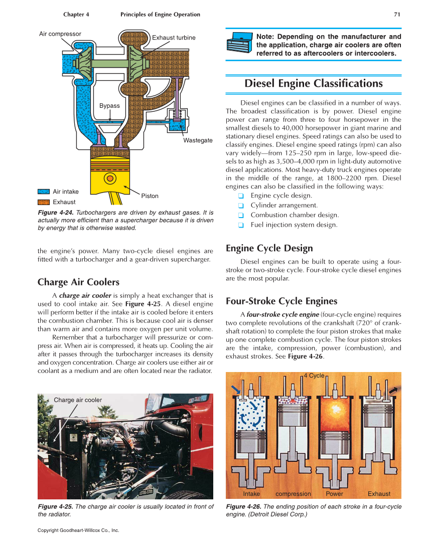 Chapter 4 Principles of Engine Operation 71 Copyright Goodheart-Willcox Co., Inc. the engine’s power. Many two-cycle diesel engines are fitted with a turbocharger and a gear-driven supercharger. Charge Air Coolers A charge air cooler is simply a heat exchanger that is used to cool intake air. See Figure 4-25. A diesel engine will perform better if the intake air is cooled before it enters the combustion chamber. This is because cool air is denser than warm air and contains more oxygen per unit volume. Remember that a turbocharger will pressurize or com- press air. When air is compressed, it heats up. Cooling the air after it passes through the turbocharger increases its density and oxygen concentration. Charge air coolers use either air or coolant as a medium and are often located near the radiator. Note: Depending on the manufacturer and the application, charge air coolers are often referred to as aftercoolers or intercoolers. Diesel Engine Classifications Diesel engines can be classified in a number of ways. The broadest classification is by power. Diesel engine power can range from three to four horsepower in the smallest diesels to 40,000 horsepower in giant marine and stationary diesel engines. Speed ratings can also be used to classify engines. Diesel engine speed ratings (rpm) can also vary widely—from 125–250 rpm in large, low-speed die- sels to as high as 3,500–4,000 rpm in light-duty automotive diesel applications. Most heavy-duty truck engines operate in the middle of the range, at 1800–2200 rpm. Diesel engines can also be classified in the following ways: ❑ Engine cycle design. ❑ Cylinder arrangement. ❑ Combustion chamber design. ❑ Fuel injection system design. Engine Cycle Design Diesel engines can be built to operate using a four- stroke or two-stroke cycle. Four-stroke cycle diesel engines are the most popular. Four-Stroke Cycle Engines A four-stroke cycle engine (four-cycle engine) requires two complete revolutions of the crankshaft (720° of crank- shaft rotation) to complete the four piston strokes that make up one complete combustion cycle. The four piston strokes are the intake, compression, power (combustion), and exhaust strokes. See Figure 4-26. Exhaust turbine Air compressor Bypass Wastegate Piston Air intake Exhaust Figure 4-24. Turbochargers are driven by exhaust gases. It is actually more efficient than a supercharger because it is driven by energy that is otherwise wasted. Figure 4-25. The charge air cooler is usually located in front of the radiator. Charge air cooler Figure 4-26. The ending position of each stroke in a four-cycle engine. (Detroit Diesel Corp.) 4 Cycle Intake compression Power Exhaust