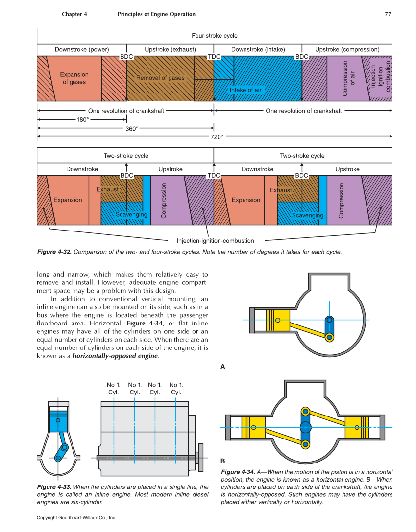 Chapter 4 Principles of Engine Operation 77 Copyright Goodheart-Willcox Co., Inc. long and narrow, which makes them relatively easy to remove and install. However, adequate engine compart- ment space may be a problem with this design. In addition to conventional vertical mounting, an inline engine can also be mounted on its side, such as in a bus where the engine is located beneath the passenger floorboard area. Horizontal, Figure 4-34, or flat inline engines may have all of the cylinders on one side or an equal number of cylinders on each side. When there are an equal number of cylinders on each side of the engine, it is known as a horizontally-opposed engine. TDC Four-stroke cycle Downstroke (power) Upstroke (exhaust) Downstroke (intake) Upstroke (compression) Expansion of gases BDC TDC Removal of gases Intake of air Compression of air Injection ignition combustion One revolution of crankshaft One revolution of crankshaft Two-stroke cycle 180° 360° 720° Two-stroke cycle Downstroke Upstroke Downstroke Upstroke BDC BDC Exhaust Expansion Scavenging Compression Injection-ignition-combustion Expansion Exhaust Scavenging Compression BDC Figure 4-32. Comparison of the two- and four-stroke cycles. Note the number of degrees it takes for each cycle. No 1. Cyl. No 1. Cyl. No 1. Cyl. No 1. Cyl. Figure 4-33. When the cylinders are placed in a single line, the engine is called an inline engine. Most modern inline diesel engines are six-cylinder. A B Figure 4-34. A—When the motion of the piston is in a horizontal position, the engine is known as a horizontal engine. B—When cylinders are placed on each side of the crankshaft, the engine is horizontally-opposed. Such engines may have the cylinders placed either vertically or horizontally.