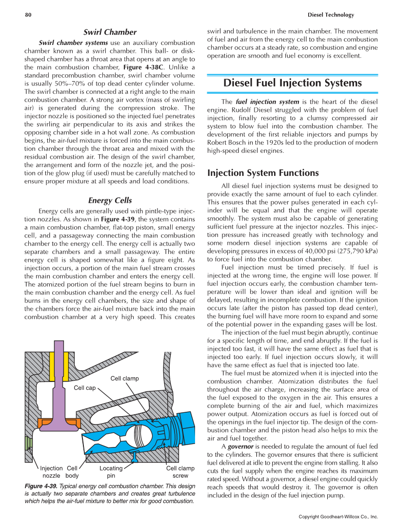 80 Diesel Technology Copyright Goodheart-Willcox Co., Inc. Swirl Chamber Swirl chamber systems use an auxiliary combustion chamber known as a swirl chamber. This ball- or disk- shaped chamber has a throat area that opens at an angle to the main combustion chamber, Figure 4-38C. Unlike a standard precombustion chamber, swirl chamber volume is usually 50%–70% of top dead center cylinder volume. The swirl chamber is connected at a right angle to the main combustion chamber. A strong air vortex (mass of swirling air) is generated during the compression stroke. The injector nozzle is positioned so the injected fuel penetrates the swirling air perpendicular to its axis and strikes the opposing chamber side in a hot wall zone. As combustion begins, the air-fuel mixture is forced into the main combus- tion chamber through the throat area and mixed with the residual combustion air. The design of the swirl chamber, the arrangement and form of the nozzle jet, and the posi- tion of the glow plug (if used) must be carefully matched to ensure proper mixture at all speeds and load conditions. Energy Cells Energy cells are generally used with pintle-type injec- tion nozzles. As shown in Figure 4-39, the system contains a main combustion chamber, flat-top piston, small energy cell, and a passageway connecting the main combustion chamber to the energy cell. The energy cell is actually two separate chambers and a small passageway. The entire energy cell is shaped somewhat like a figure eight. As injection occurs, a portion of the main fuel stream crosses the main combustion chamber and enters the energy cell. The atomized portion of the fuel stream begins to burn in the main combustion chamber and the energy cell. As fuel burns in the energy cell chambers, the size and shape of the chambers force the air-fuel mixture back into the main combustion chamber at a very high speed. This creates swirl and turbulence in the main chamber. The movement of fuel and air from the energy cell to the main combustion chamber occurs at a steady rate, so combustion and engine operation are smooth and fuel economy is excellent. Diesel Fuel Injection Systems The fuel injection system is the heart of the diesel engine. Rudolf Diesel struggled with the problem of fuel injection, finally resorting to a clumsy compressed air system to blow fuel into the combustion chamber. The development of the first reliable injectors and pumps by Robert Bosch in the 1920s led to the production of modern high-speed diesel engines. Injection System Functions All diesel fuel injection systems must be designed to provide exactly the same amount of fuel to each cylinder. This ensures that the power pulses generated in each cyl- inder will be equal and that the engine will operate smoothly. The system must also be capable of generating sufficient fuel pressure at the injector nozzles. This injec- tion pressure has increased greatly with technology and some modern diesel injection systems are capable of developing pressures in excess of 40,000 psi (275,790 kPa) to force fuel into the combustion chamber. Fuel injection must be timed precisely. If fuel is injected at the wrong time, the engine will lose power. If fuel injection occurs early, the combustion chamber tem- perature will be lower than ideal and ignition will be delayed, resulting in incomplete combustion. If the ignition occurs late (after the piston has passed top dead center), the burning fuel will have more room to expand and some of the potential power in the expanding gases will be lost. The injection of the fuel must begin abruptly, continue for a specific length of time, and end abruptly. If the fuel is injected too fast, it will have the same effect as fuel that is injected too early. If fuel injection occurs slowly, it will have the same effect as fuel that is injected too late. The fuel must be atomized when it is injected into the combustion chamber. Atomization distributes the fuel throughout the air charge, increasing the surface area of the fuel exposed to the oxygen in the air. This ensures a complete burning of the air and fuel, which maximizes power output. Atomization occurs as fuel is forced out of the openings in the fuel injector tip. The design of the com- bustion chamber and the piston head also helps to mix the air and fuel together. A governor is needed to regulate the amount of fuel fed to the cylinders. The governor ensures that there is sufficient fuel delivered at idle to prevent the engine from stalling. It also cuts the fuel supply when the engine reaches its maximum rated speed. Without a governor, a diesel engine could quickly reach speeds that would destroy it. The governor is often included in the design of the fuel injection pump. Cell clamp Cell cap Injection nozzle Cell body Locating pin Cell clamp screw Figure 4-39. Typical energy cell combustion chamber. This design is actually two separate chambers and creates great turbulence which helps the air-fuel mixture to better mix for good combustion.