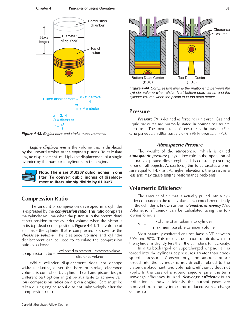 Chapter 4 Principles of Engine Operation 83 Copyright Goodheart-Willcox Co., Inc. Engine displacement is the volume that is displaced by the upward strokes of the engine’s pistons. To calculate engine displacement, multiply the displacement of a single cylinder by the number of cylinders in the engine. Note: There are 61.0237 cubic inches in one liter. To convert cubic inches of displace- ment to liters simply divide by 61.0327. Compression Ratio The amount of compression developed in a cylinder is expressed by the compression ratio. This ratio compares the cylinder volume when the piston is in the bottom dead center position to the cylinder volume when the piston is in its top dead center position, Figure 4-44. The volume of air inside the cylinder that is compressed is known as the clearance volume. The clearance volume and cylinder displacement can be used to calculate the compression ratio as follows: compression ratio = cylinder displacement + clearance volume clearance volume While cylinder displacement does not change without altering either the bore or stroke, clearance volume is controlled by cylinder head and piston design. Different part options might be available to achieve var- ious compression ratios on a given engine. Care must be taken during engine rebuild to not unknowingly alter the compression ratio. Pressure Pressure (P) is defined as force per unit area. Gas and liquid pressures are normally stated in pounds per square inch (psi). The metric unit of pressure is the pascal (Pa). One psi equals 6,895 pascals or 6.895 kilopascals (kPa). Atmospheric Pressure The weight of the atmosphere, which is called atmospheric pressure plays a key role in the operation of naturally aspirated diesel engines. It is constantly exerting force on all objects. At sea level, this force creates a pres- sure equal to 14.7 psi. At higher elevations, the pressure is less and may cause engine performance problems. Volumetric Efficiency The amount of air that is actually pulled into a cyl- inder compared to the total volume that could theoretically fill the cylinder is known as the volumetric efficiency (VE). Volumetric efficiency can be calculated using the fol- lowing formula: VE = volume of air taken into cylinder maximum possible cylinder volume Most naturally aspirated engines have a VE between 80% and 90%. This means the amount of air drawn into the cylinder is slightly less than the cylinder’s full capacity. In a turbocharged or supercharged engine, air is forced into the cylinder at pressures greater than atmo- spheric pressure. Consequently, the amount of air forced into the cylinder is not directly related to the piston displacement, and volumetric efficiency does not apply. In the case of a supercharged engine, the term scavenge efficiency is used. Scavenge efficiency is an indication of how efficiently the burned gases are removed from the cylinder and replaced with a charge of fresh air. Stoke length Diameter of cylinder Top of piston Combustion chamber Figure 4-43. Engine bore and stroke measurements. Clearance volume Top Dead Center (TDC) Bottom Dead Center (BDC) Figure 4-44. Compression ratio is the relationship between the cylinder volume when piston is at bottom dead center and the cylinder volume when the piston is at top dead center.
