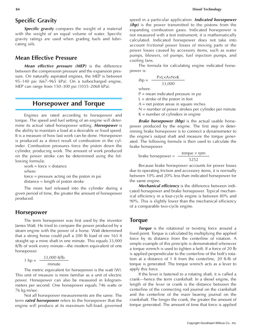 84 Diesel Technology Copyright Goodheart-Willcox Co., Inc. Specific Gravity Specific gravity compares the weight of a material with the weight of an equal volume of water. Specific gravity ratings are used when grading fuels and lubri- cating oils. Mean Effective Pressure Mean effective pressure (MEP) is the difference between the compression pressure and the expansion pres- sure. On naturally aspirated engines, the MEP is between 95–140 psi (667–965 kPa). On a turbocharged engine, MEP can range from 150–300 psi (1035–2068 kPa). Horsepower and Torque Engines are rated according to horsepower and torque. The speed and fuel setting of an engine will deter- mine its actual rated horsepower setting. Horsepower is the ability to maintain a load at a desirable or fixed speed. It is a measure of how fast work can be done. Horsepower is produced as a direct result of combustion in the cyl- inder. Combustion pressures force the piston down the cylinder, producing work. The amount of work produced on the power stroke can be determined using the fol- lowing formula: work = force × distance where: force = pressure acting on the piston in psi distance = length of piston stroke The more fuel released into the cylinder during a given period of time, the greater the amount of horsepower produced. Horsepower The term horsepower was first used by the inventor James Watt. He tried to compare the power produced by a steam engine with the power of a horse. Watt determined that a strong horse could pull a 200 lb load of ore 165 ft straight up a mine shaft in one minute. This equals 33,000 ft/lb of work every minute—the modern equivalent of one horsepower. 1 hp = 33,000 ft/lb minute The metric equivalent for horsepower is the watt (W). This unit of measure is more familiar as a unit of electric power. Horsepower can also be measured in kilogram- meters per second. One horsepower equals 746 watts or 76 kg-m/sec. Not all horsepower measurements are the same. The term rated horsepower refers to the horsepower that the engine will produce at its maximum full-load, governed speed in a particular application. Indicated horsepower (ihp) is the power transmitted to the pistons from the expanding combustion gases. Indicated horsepower is not measured with a test instrument it is mathematically calculated. Indicated horsepower does not take into account frictional power losses of moving parts or the power losses caused by accessory items, such as water pumps, blowers, oil pumps, fuel injection pumps, and cooling fans. The formula for calculating engine indicated horse- power is: ihp = P×L×A×N×K 33,000 where: P = mean indicated pressure in psi L = stroke of the piston in feet A = net piston areas in square inches N = number of power strokes per cylinder per minute K = number of cylinders in engine Brake horsepower (bhp) is the actual usable horse- power produced by the engine. The first step in deter- mining brake horsepower is to connect a dynamometer to the engine’s output shaft and measure the torque gener- ated. The following formula is then used to calculate the brake horsepower. brake horsepower = torque × rpm 5252 Because brake horsepower accounts for power losses due to operating friction and accessory items, it is normally between 10% and 20% less than indicated horsepower for the same engine. Mechanical efficiency is the difference between indi- cated horsepower and brake horsepower. Typical mechan- ical efficiency in a four-cycle engine is between 80% and 90%. This is slightly lower than the mechanical efficiency of a comparable two-cycle engine. Torque Torque is the rotational or twisting force around a fixed point. Torque is calculated by multiplying the applied force by its distance from the centerline of rotation. A simple example of this principle is demonstrated whenever a torque wrench is used to tighten a bolt. If a force of 20 lb is applied perpendicular to the centerline of the bolt’s rota- tion at a distance of 1 ft from the centerline, 20 ft-lb of torque is generated. The torque wrench acts as a lever to apply this force. If the lever is fastened to a rotating shaft, it is called a crank—hence the term crankshaft. In a diesel engine, the length of the lever or crank is the distance between the centerline of the connecting rod journal on the crankshaft and the centerline of the main bearing journal on the crankshaft. The longer the crank, the greater the amount of torque generated. The amount of time that force is applied