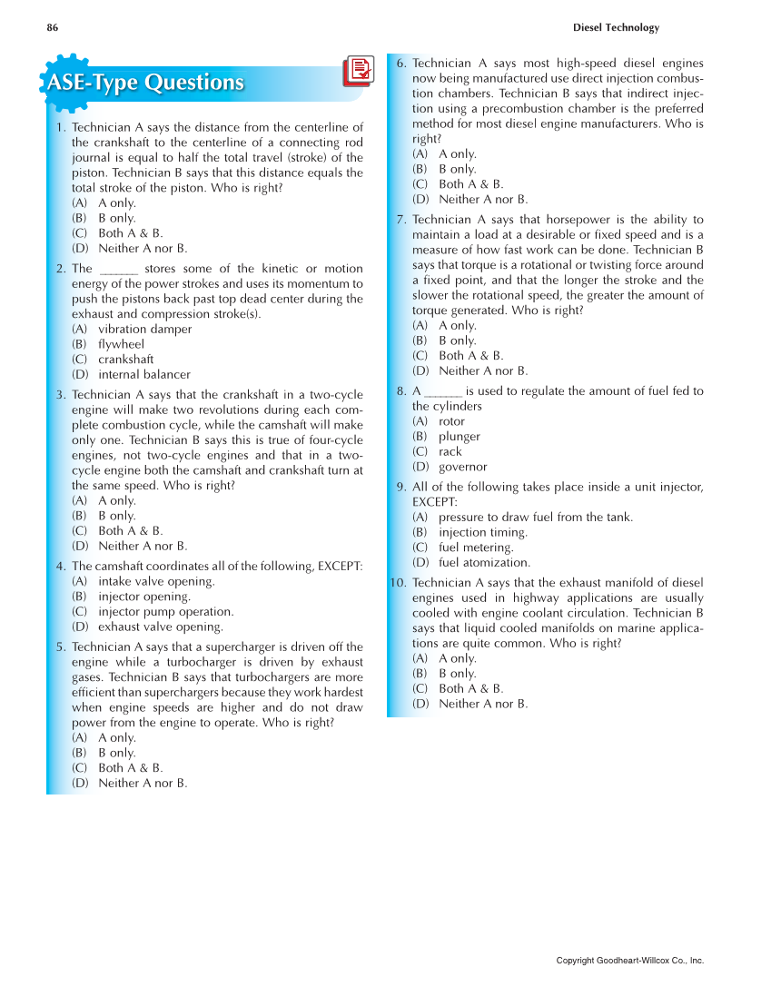 86 Diesel Technology Copyright Goodheart-Willcox Co., Inc. 1. Technician A says the distance from the centerline of the crankshaft to the centerline of a connecting rod journal is equal to half the total travel (stroke) of the piston. Technician B says that this distance equals the total stroke of the piston. Who is right? (A) A only. (B) B only. (C) Both A & B. (D) Neither A nor B. 2. The _______ stores some of the kinetic or motion energy of the power strokes and uses its momentum to push the pistons back past top dead center during the exhaust and compression stroke(s). (A) vibration damper (B) flywheel (C) crankshaft (D) internal balancer 3. Technician A says that the crankshaft in a two-cycle engine will make two revolutions during each com- plete combustion cycle, while the camshaft will make only one. Technician B says this is true of four-cycle engines, not two-cycle engines and that in a two- cycle engine both the camshaft and crankshaft turn at the same speed. Who is right? (A) A only. (B) B only. (C) Both A & B. (D) Neither A nor B. 4. The camshaft coordinates all of the following, EXCEPT: (A) intake valve opening. (B) injector opening. (C) injector pump operation. (D) exhaust valve opening. 5. Technician A says that a supercharger is driven off the engine while a turbocharger is driven by exhaust gases. Technician B says that turbochargers are more efficient than superchargers because they work hardest when engine speeds are higher and do not draw power from the engine to operate. Who is right? (A) A only. (B) B only. (C) Both A & B. (D) Neither A nor B. ASE-Type Questions 6. Technician A says most high-speed diesel engines now being manufactured use direct injection combus- tion chambers. Technician B says that indirect injec- tion using a precombustion chamber is the preferred method for most diesel engine manufacturers. Who is right? (A) A only. (B) B only. (C) Both A & B. (D) Neither A nor B. 7. Technician A says that horsepower is the ability to maintain a load at a desirable or fixed speed and is a measure of how fast work can be done. Technician B says that torque is a rotational or twisting force around a fixed point, and that the longer the stroke and the slower the rotational speed, the greater the amount of torque generated. Who is right? (A) A only. (B) B only. (C) Both A & B. (D) Neither A nor B. 8. A _______ is used to regulate the amount of fuel fed to the cylinders (A) rotor (B) plunger (C) rack (D) governor 9. All of the following takes place inside a unit injector, EXCEPT: (A) pressure to draw fuel from the tank. (B) injection timing. (C) fuel metering. (D) fuel atomization. 10. Technician A says that the exhaust manifold of diesel engines used in highway applications are usually cooled with engine coolant circulation. Technician B says that liquid cooled manifolds on marine applica- tions are quite common. Who is right? (A) A only. (B) B only. (C) Both A & B. (D) Neither A nor B.