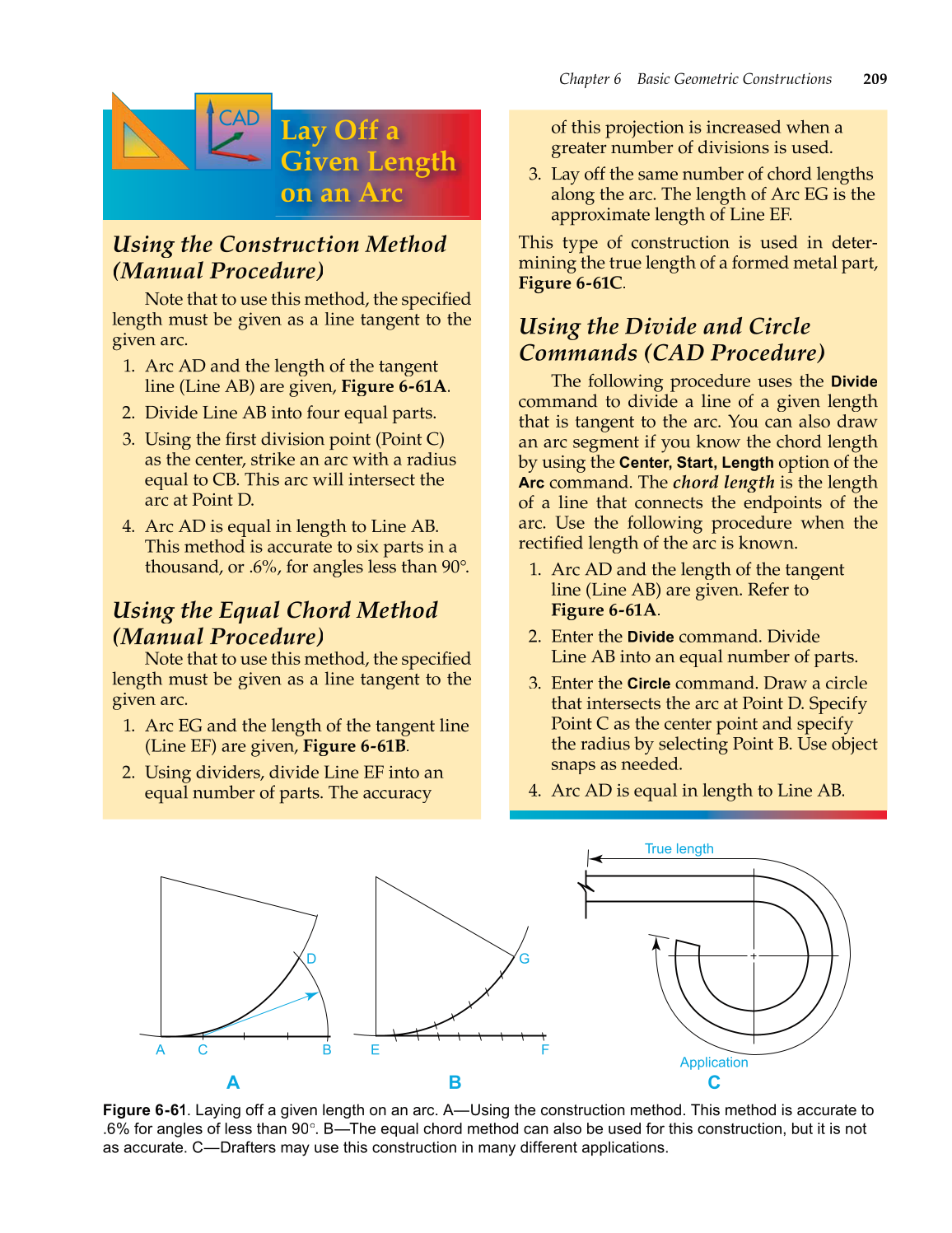Figure 6-61. Laying off a given length on an arc. A—Using the construction method. This method is accurate to