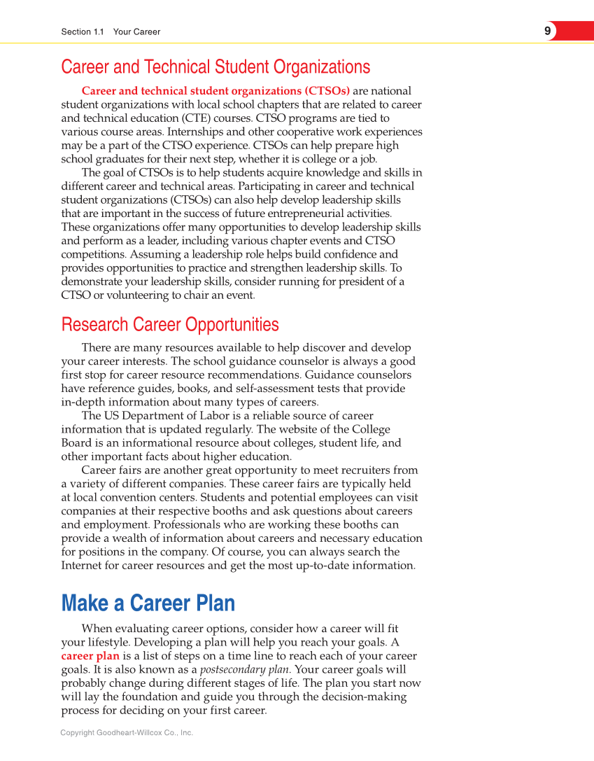 9 Section 1.1 Your Career Copyright Goodheart-Willcox Co., Inc. Career and Technical Student Organizations Career and technical student organizations (CTSOs) are national student organizations with local school chapters that are related to career and technical education (CTE) courses. CTSO programs are tied to various course areas. Internships and other cooperative work experiences may be a part of the CTSO experience. CTSOs can help prepare high school graduates for their next step, whether it is college or a job. The goal of CTSOs is to help students acquire knowledge and skills in different career and technical areas. Participating in career and technical student organizations (CTSOs) can also help develop leadership skills that are important in the success of future entrepreneurial activities. These organizations offer many opportunities to develop leadership skills and perform as a leader, including various chapter events and CTSO competitions. Assuming a leadership role helps build confidence and provides opportunities to practice and strengthen leadership skills. To demonstrate your leadership skills, consider running for president of a CTSO or volunteering to chair an event. Research Career Opportunities There are many resources available to help discover and develop your career interests. The school guidance counselor is always a good first stop for career resource recommendations. Guidance counselors have reference guides, books, and self-assessment tests that provide in-depth information about many types of careers. The US Department of Labor is a reliable source of career information that is updated regularly. The website of the College Board is an informational resource about colleges, student life, and other important facts about higher education. Career fairs are another great opportunity to meet recruiters from a variety of different companies. These career fairs are typically held at local convention centers. Students and potential employees can visit companies at their respective booths and ask questions about careers and employment. Professionals who are working these booths can provide a wealth of information about careers and necessary education for positions in the company. Of course, you can always search the Internet for career resources and get the most up-to-date information. Make a Career Plan When evaluating career options, consider how a career will fit your lifestyle. Developing a plan will help you reach your goals. A career plan is a list of steps on a time line to reach each of your career goals. It is also known as a postsecondary plan. Your career goals will probably change during different stages of life. The plan you start now will lay the foundation and guide you through the decision-making process for deciding on your first career.