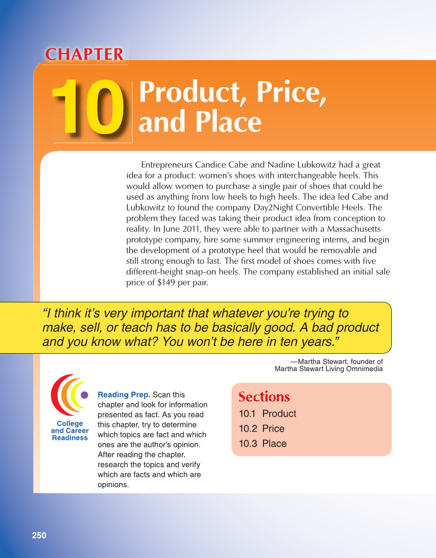 250 College and Career Readiness Entrepreneurs Candice Cabe and Nadine Lubkowitz had a great idea for a product: women’s shoes with interchangeable heels. This would allow women to purchase a single pair of shoes that could be used as anything from low heels to high heels. The idea led Cabe and Lubkowitz to found the company Day2Night Convertible Heels. The problem they faced was taking their product idea from conception to reality. In June 2011, they were able to partner with a Massachusetts prototype company, hire some summer engineering interns, and begin the development of a prototype heel that would be removable and still strong enough to last. The first model of shoes comes with five different-height snap-on heels. The company established an initial sale price of $149 per pair. Reading Prep. Scan this chapter and look for information presented as fact. As you read this chapter, try to determine which topics are fact and which ones are the author’s opinion. After reading the chapter, research the topics and verify which are facts and which are opinions. 10 Product, Price, and Place “I think it’s very important that whatever you’re trying to make, sell, or teach has to be basically good. A bad product and you know what? You won’t be here in ten years.” 10.1 Product 10.2 Price 10.3 Place CHAPTER —Martha Stewart, founder of Martha Stewart Living Omnimedia