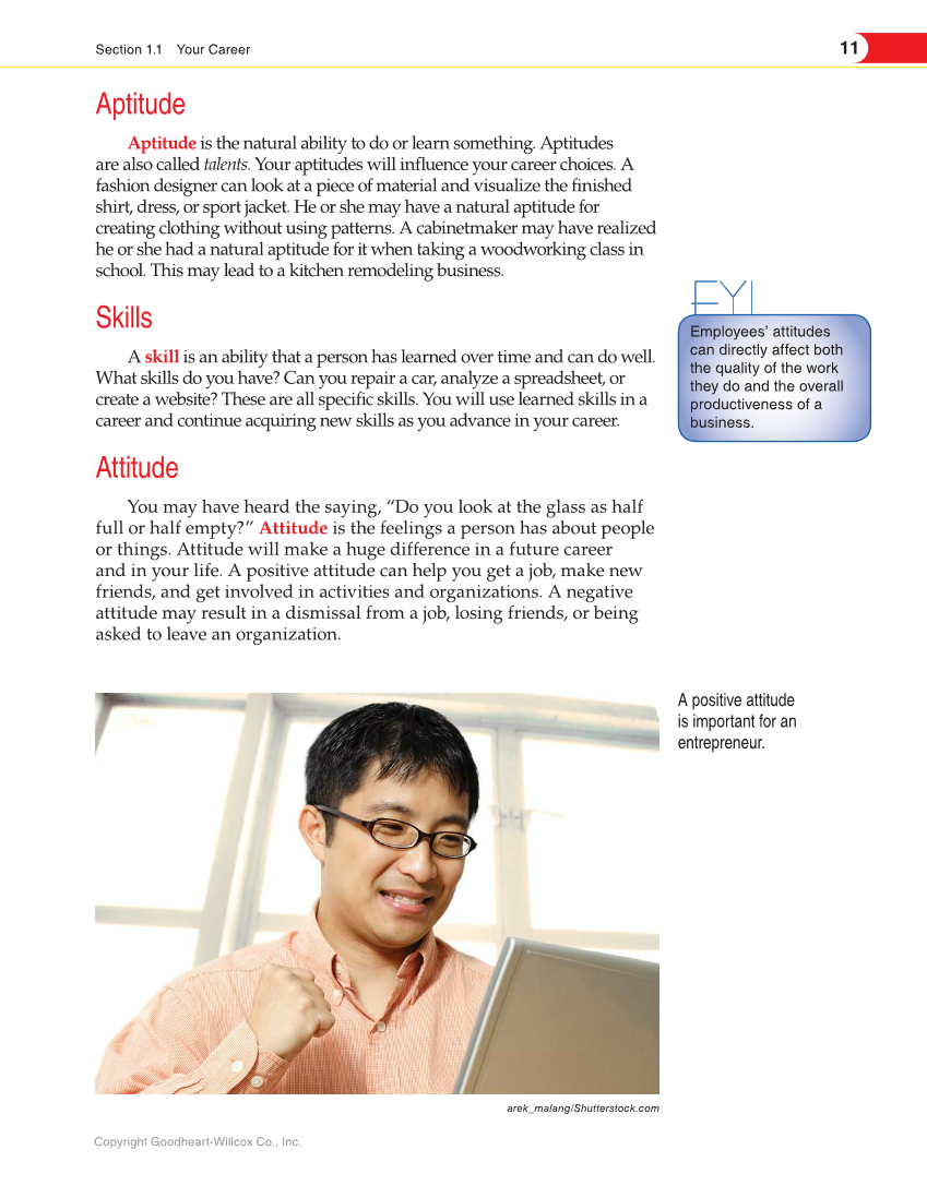 11 Section 1.1 Your Career Copyright Goodheart-Willcox Co., Inc. Aptitude Aptitude is the natural ability to do or learn something. Aptitudes are also called talents. Your aptitudes will influence your career choices. A fashion designer can look at a piece of material and visualize the finished shirt, dress, or sport jacket. He or she may have a natural aptitude for creating clothing without using patterns. A cabinetmaker may have realized he or she had a natural aptitude for it when taking a woodworking class in school. This may lead to a kitchen remodeling business. Skills A skill is an ability that a person has learned over time and can do well. What skills do you have? Can you repair a car, analyze a spreadsheet, or create a website? These are all specific skills. You will use learned skills in a career and continue acquiring new skills as you advance in your career. Attitude You may have heard the saying, “Do you look at the glass as half full or half empty?” Attitude is the feelings a person has about people or things. Attitude will make a huge difference in a future career and in your life. A positive attitude can help you get a job, make new friends, and get involved in activities and organizations. A negative attitude may result in a dismissal from a job, losing friends, or being asked to leave an organization. A positive attitude is important for an entrepreneur. arek_malang/Shutterstock.com FYI Employees’ attitudes can directly affect both the quality of the work they do and the overall productiveness of a business.