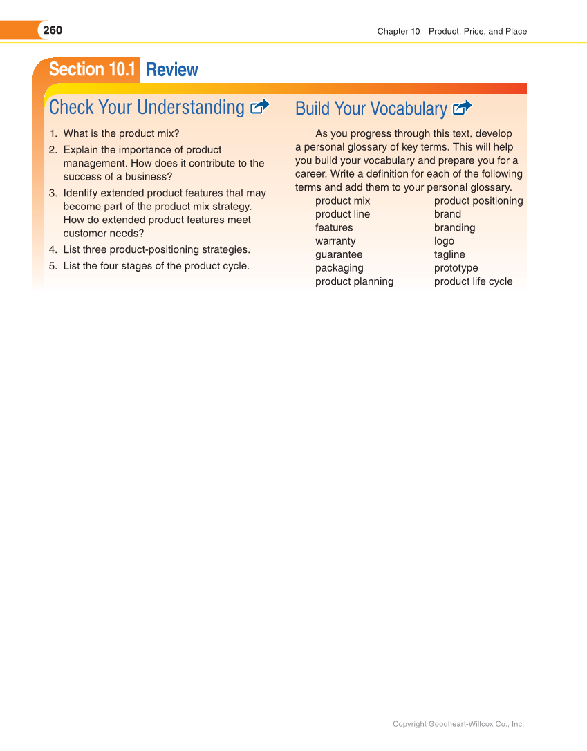 260 Chapter 10 Product, Price, and Place Copyright Goodheart-Willcox Co., Inc. Section 10.1 Check Your Understanding 1. What is the product mix? 2. Explain the importance of product management. How does it contribute to the success of a business? 3. Identify extended product features that may become part of the product mix strategy. How do extended product features meet customer needs? 4. List three product-positioning strategies. 5. List the four stages of the product cycle. Build Your Vocabulary As you progress through this text, develop a personal glossary of key terms. This will help you build your vocabulary and prepare you for a career. Write a definition for each of the following terms and add them to your personal glossary. product mix product line features warranty guarantee packaging product planning product positioning brand branding logo tagline prototype product life cycle Review
