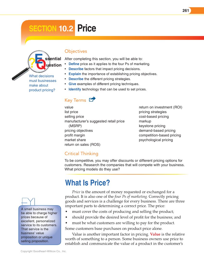261 Copyright Goodheart-Willcox Co., Inc. Objectives After completing this section, you will be able to: • Define price as it applies to the four Ps of marketing. • Describe factors that impact pricing decisions. • Explain the importance of establishing pricing objectives. • Describe the different pricing strategies. • Give examples of different pricing techniques. • Identify technology that can be used to set prices. Key Terms value list price selling price manufacturer’s suggested retail price (MSRP) pricing objectives profit margin market share return on sales (ROS) return on investment (ROI) pricing strategies cost-based pricing markup keystone pricing demand-based pricing competition-based pricing psychological pricing Critical Thinking To be competitive, you may offer discounts or different pricing options for customers. Research the companies that will compete with your business. What pricing models do they use? SECTION 10.2 Price What Is Price? Price is the amount of money requested or exchanged for a product. It is also one of the four Ps of marketing. Correctly pricing goods and services is a challenge for every business. There are three important parts to determining a correct price. The price: • must cover the costs of producing and selling the product • should provide the desired level of profit for the business and • must be what customers are willing to pay for the product. Some customers base purchases on product price alone. Value is another important factor in pricing. Value is the relative worth of something to a person. Some business owners use price to establish and communicate the value of a product in the customer’s What decisions must businesses make about product pricing? What decisio mu st busines FYI A small business may be able to charge higher prices because of excellent, personalized service to its customers. That service is the business’ value proposition or unique selling proposition.