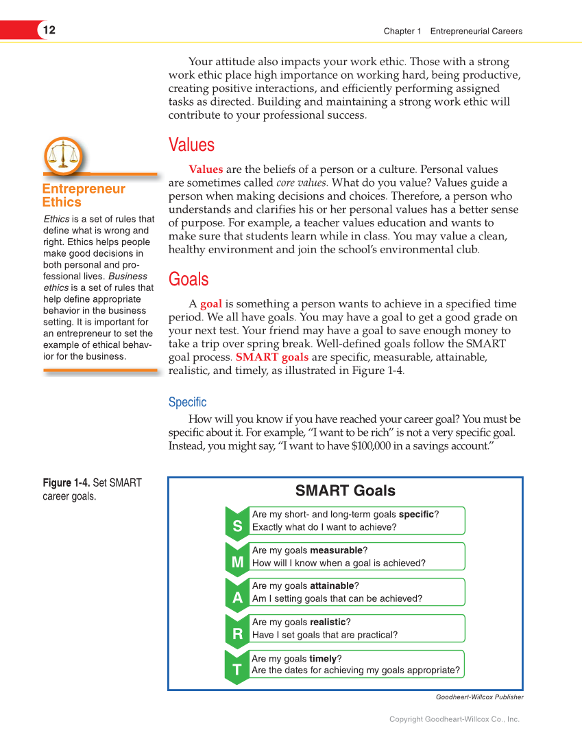 12 Chapter 1 Entrepreneurial Careers Copyright Goodheart-Willcox Co., Inc. Your attitude also impacts your work ethic. Those with a strong work ethic place high importance on working hard, being productive, creating positive interactions, and efficiently performing assigned tasks as directed. Building and maintaining a strong work ethic will contribute to your professional success. Values Values are the beliefs of a person or a culture. Personal values are sometimes called core values. What do you value? Values guide a person when making decisions and choices. Therefore, a person who understands and clarifies his or her personal values has a better sense of purpose. For example, a teacher values education and wants to make sure that students learn while in class. You may value a clean, healthy environment and join the school’s environmental club. Goals A goal is something a person wants to achieve in a specified time period. We all have goals. You may have a goal to get a good grade on your next test. Your friend may have a goal to save enough money to take a trip over spring break. Well-defined goals follow the SMART goal process. SMART goals are specific, measurable, attainable, realistic, and timely, as illustrated in Figure 1-4. Specific How will you know if you have reached your career goal? You must be specific about it. For example, “I want to be rich” is not a very specific goal. Instead, you might say, “I want to have $100,000 in a savings account.” Ethics is a set of rules that define what is wrong and right. Ethics helps people make good decisions in both personal and pro- fessional lives. Business ethics is a set of rules that help define appropriate behavior in the business setting. It is important for an entrepreneur to set the example of ethical behav- ior for the business. Entrepreneur Ethics Figure 1-4. Set SMART career goals. S Are my short- and long-term goals specific? Exactly what do I want to achieve? M Are my goals measurable? How will I know when a goal is achieved? A Are my goals attainable? Am I setting goals that can be achieved? R Are my goals realistic? Have I set goals that are practical? T Are my goals timely? Are the dates for achieving my goals appropriate? SMART Goals Goodheart-Willcox Publisher