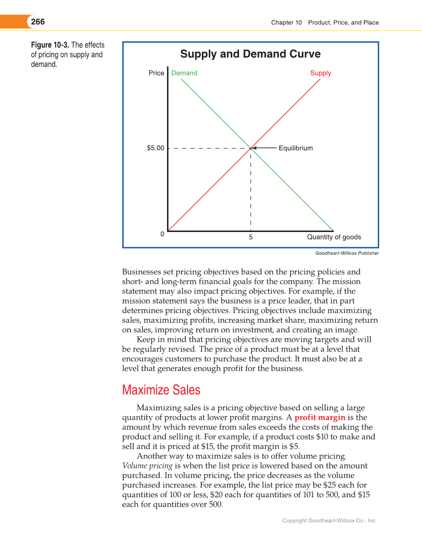 266 Chapter 10 Product, Price, and Place Copyright Goodheart-Willcox Co., Inc. Businesses set pricing objectives based on the pricing policies and short- and long-term financial goals for the company. The mission statement may also impact pricing objectives. For example, if the mission statement says the business is a price leader, that in part determines pricing objectives. Pricing objectives include maximizing sales, maximizing profits, increasing market share, maximizing return on sales, improving return on investment, and creating an image. Keep in mind that pricing objectives are moving targets and will be regularly revised. The price of a product must be at a level that encourages customers to purchase the product. It must also be at a level that generates enough profit for the business. Maximize Sales Maximizing sales is a pricing objective based on selling a large quantity of products at lower profit margins. A profit margin is the amount by which revenue from sales exceeds the costs of making the product and selling it. For example, if a product costs $10 to make and sell and it is priced at $15, the profit margin is $5. Another way to maximize sales is to offer volume pricing. Volume pricing is when the list price is lowered based on the amount purchased. In volume pricing, the price decreases as the volume purchased increases. For example, the list price may be $25 each for quantities of 100 or less, $20 each for quantities of 101 to 500, and $15 each for quantities over 500. Goodheart-Willcox Publisher Figure 10-3. The effects of pricing on supply and demand. Supply and Demand Curve Quantity of goods 5 Price 0 $5.00 Demand Supply Equilibrium