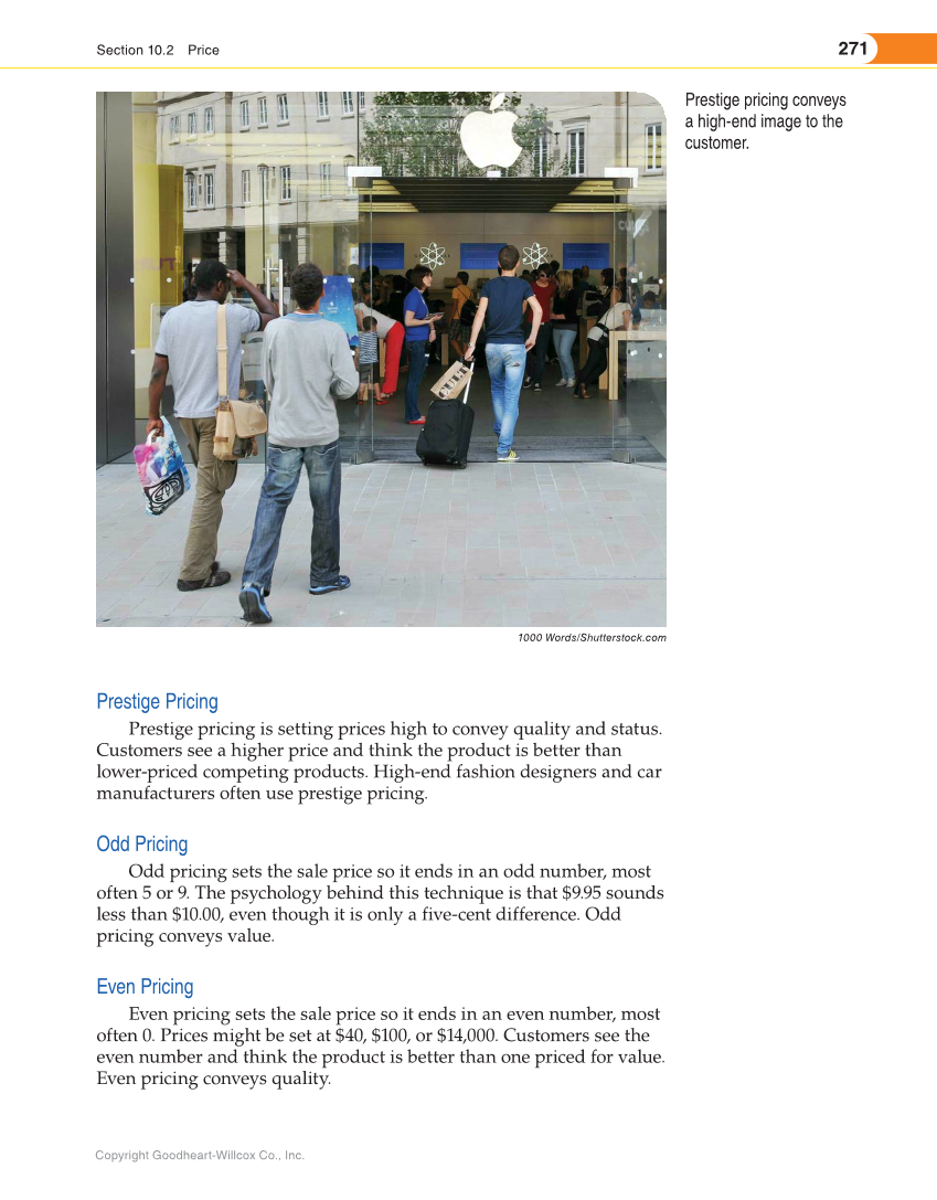 271 Section 10.2 Price Copyright Goodheart-Willcox Co., Inc. Prestige Pricing Prestige pricing is setting prices high to convey quality and status. Customers see a higher price and think the product is better than lower-priced competing products. High-end fashion designers and car manufacturers often use prestige pricing. Odd Pricing Odd pricing sets the sale price so it ends in an odd number, most often 5 or 9. The psychology behind this technique is that $9.95 sounds less than $10.00, even though it is only a five-cent difference. Odd pricing conveys value. Even Pricing Even pricing sets the sale price so it ends in an even number, most often 0. Prices might be set at $40, $100, or $14,000. Customers see the even number and think the product is better than one priced for value. Even pricing conveys quality. 1000 Words/Shutterstock.com Prestige pricing conveys a high-end image to the customer.
