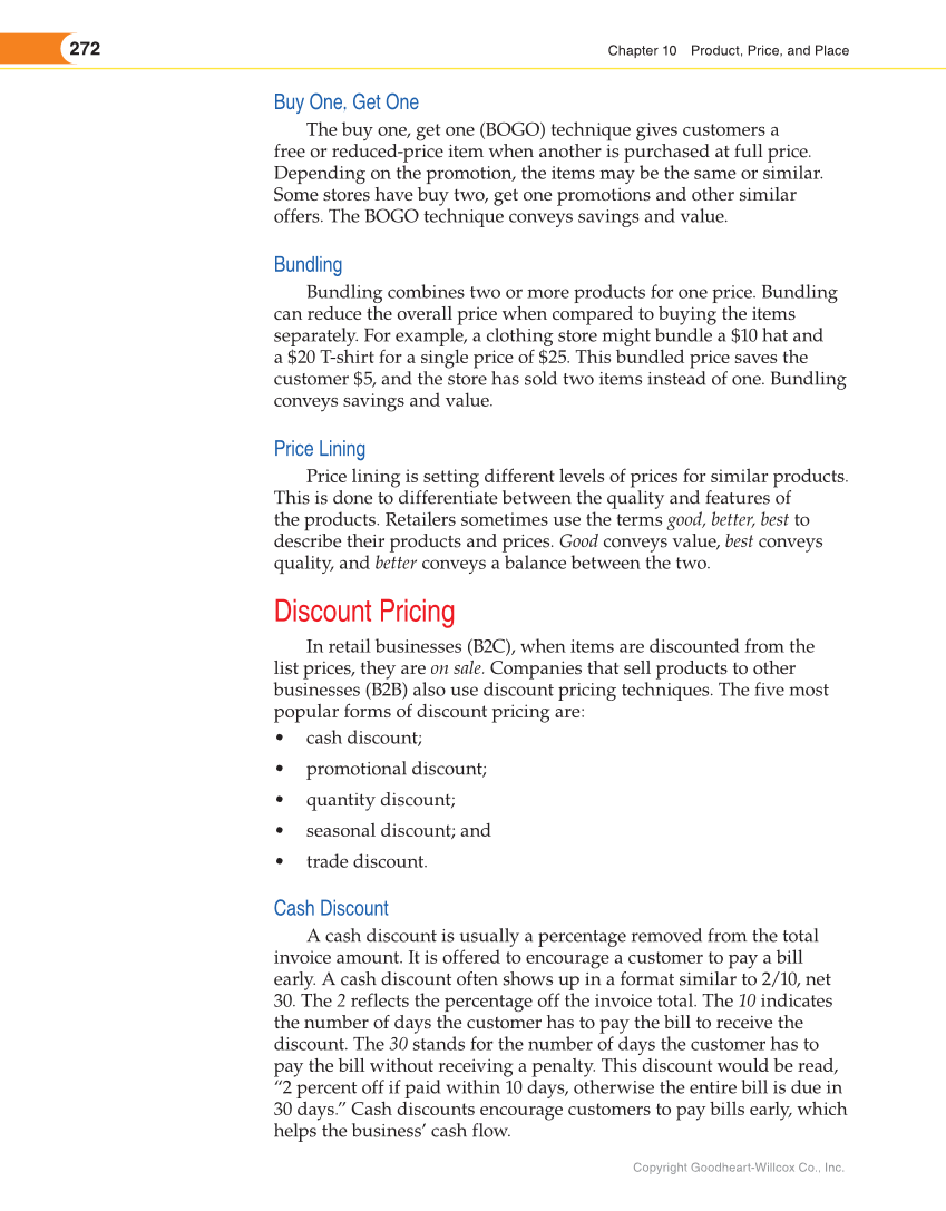 272 Chapter 10 Product, Price, and Place Copyright Goodheart-Willcox Co., Inc. Buy One, Get One The buy one, get one (BOGO) technique gives customers a free or reduced-price item when another is purchased at full price. Depending on the promotion, the items may be the same or similar. Some stores have buy two, get one promotions and other similar offers. The BOGO technique conveys savings and value. Bundling Bundling combines two or more products for one price. Bundling can reduce the overall price when compared to buying the items separately. For example, a clothing store might bundle a $10 hat and a $20 T-shirt for a single price of $25. This bundled price saves the customer $5, and the store has sold two items instead of one. Bundling conveys savings and value. Price Lining Price lining is setting different levels of prices for similar products. This is done to differentiate between the quality and features of the products. Retailers sometimes use the terms good, better, best to describe their products and prices. Good conveys value, best conveys quality, and better conveys a balance between the two. Discount Pricing In retail businesses (B2C), when items are discounted from the list prices, they are on sale. Companies that sell products to other businesses (B2B) also use discount pricing techniques. The five most popular forms of discount pricing are: • cash discount • promotional discount • quantity discount • seasonal discount and • trade discount. Cash Discount A cash discount is usually a percentage removed from the total invoice amount. It is offered to encourage a customer to pay a bill early. A cash discount often shows up in a format similar to 2/10, net 30. The 2 reflects the percentage off the invoice total. The 10 indicates the number of days the customer has to pay the bill to receive the discount. The 30 stands for the number of days the customer has to pay the bill without receiving a penalty. This discount would be read, “2 percent off if paid within 10 days, otherwise the entire bill is due in 30 days.” Cash discounts encourage customers to pay bills early, which helps the business’ cash flow.