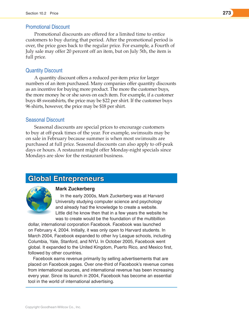 273 Section 10.2 Price Copyright Goodheart-Willcox Co., Inc. Promotional Discount Promotional discounts are offered for a limited time to entice customers to buy during that period. After the promotional period is over, the price goes back to the regular price. For example, a Fourth of July sale may offer 20 percent off an item, but on July 5th, the item is full price. Quantity Discount A quantity discount offers a reduced per-item price for larger numbers of an item purchased. Many companies offer quantity discounts as an incentive for buying more product. The more the customer buys, the more money he or she saves on each item. For example, if a customer buys 48 sweatshirts, the price may be $22 per shirt. If the customer buys 96 shirts, however, the price may be $18 per shirt. Seasonal Discount Seasonal discounts are special prices to encourage customers to buy at off-peak times of the year. For example, swimsuits may be on sale in February because summer is when most swimsuits are purchased at full price. Seasonal discounts can also apply to off-peak days or hours. A restaurant might offer Monday-night specials since Mondays are slow for the restaurant business. Global Entrepreneurs Global Entrepreneurs Mark Zuckerberg In the early 2000s, Mark Zuckerberg was at Harvard University studying computer science and psychology and already had the knowledge to create a website. Little did he know then that in a few years the website he was to create would be the foundation of the multibillion dollar, international corporation Facebook. Facebook was launched on February 4, 2004. Initially, it was only open to Harvard students. In March 2004, Facebook expanded to other Ivy League schools, including Columbia, Yale, Stanford, and NYU. In October 2005, Facebook went global. It expanded to the United Kingdom, Puerto Rico, and Mexico first, followed by other countries. Facebook earns revenue primarily by selling advertisements that are placed on Facebook pages. Over one-third of Facebook’s revenue comes from international sources, and international revenue has been increasing every year. Since its launch in 2004, Facebook has become an essential tool in the world of international advertising.