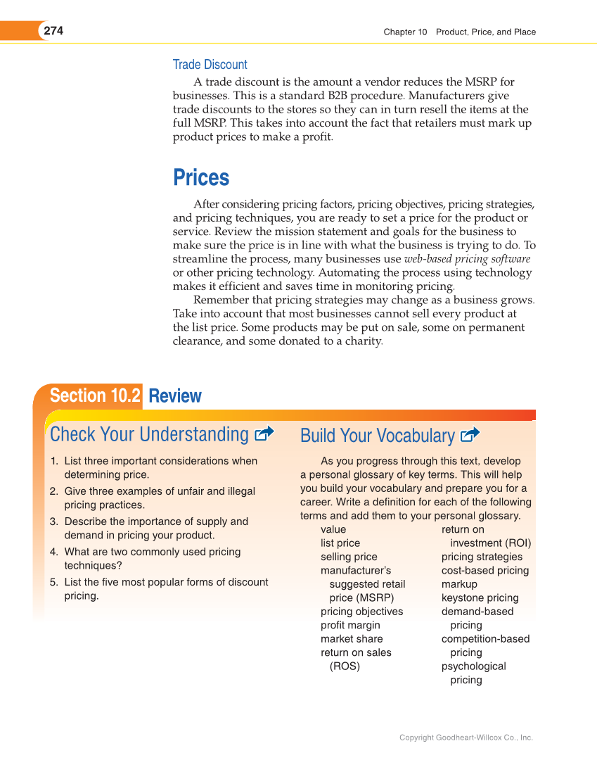 274 Chapter 10 Product, Price, and Place Copyright Goodheart-Willcox Co., Inc. Section 10.2 Check Your Understanding 1. List three important considerations when determining price. 2. Give three examples of unfair and illegal pricing practices. 3. Describe the importance of supply and demand in pricing your product. 4. What are two commonly used pricing techniques? 5. List the five most popular forms of discount pricing. Build Your Vocabulary As you progress through this text, develop a personal glossary of key terms. This will help you build your vocabulary and prepare you for a career. Write a definition for each of the following terms and add them to your personal glossary. value list price selling price manufacturer’s suggested retail price (MSRP) pricing objectives profit margin market share return on sales (ROS) return on investment (ROI) pricing strategies cost-based pricing markup keystone pricing demand-based pricing competition-based pricing psychological pricing Review Trade Discount A trade discount is the amount a vendor reduces the MSRP for businesses. This is a standard B2B procedure. Manufacturers give trade discounts to the stores so they can in turn resell the items at the full MSRP. This takes into account the fact that retailers must mark up product prices to make a profit. Prices After considering pricing factors, pricing objectives, pricing strategies, and pricing techniques, you are ready to set a price for the product or service. Review the mission statement and goals for the business to make sure the price is in line with what the business is trying to do. To streamline the process, many businesses use web-based pricing software or other pricing technology. Automating the process using technology makes it efficient and saves time in monitoring pricing. Remember that pricing strategies may change as a business grows. Take into account that most businesses cannot sell every product at the list price. Some products may be put on sale, some on permanent clearance, and some donated to a charity.