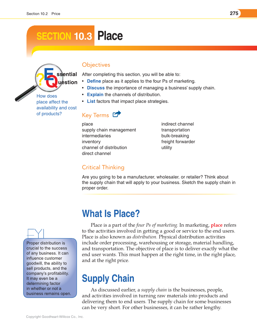 275 Section 10.2 Price Copyright Goodheart-Willcox Co., Inc. Objectives After completing this section, you will be able to: • Define place as it applies to the four Ps of marketing. • Discuss the importance of managing a business’ supply chain. • Explain the channels of distribution. • List factors that impact place strategies. Key Terms place supply chain management intermediaries inventory channel of distribution direct channel indirect channel transportation bulk-breaking freight forwarder utility Critical Thinking Are you going to be a manufacturer, wholesaler, or retailer? Think about the supply chain that will apply to your business. Sketch the supply chain in proper order. SECTION 10.3 Place How does place affect the availability and cost of products? How does place affe ct t h What Is Place? Place is a part of the four Ps of marketing. In marketing, place refers to the activities involved in getting a good or service to the end users. Place is also known as distribution. Physical distribution activities include order processing, warehousing or storage, material handling, and transportation. The objective of place is to deliver exactly what the end user wants. This must happen at the right time, in the right place, and at the right price. Supply Chain As discussed earlier, a supply chain is the businesses, people, and activities involved in turning raw materials into products and delivering them to end users. The supply chain for some businesses can be very short. For other businesses, it can be rather lengthy. FYI Proper distribution is crucial to the success of any business. It can influence customer goodwill, the ability to sell products, and the company’s profitability. It may even be a determining factor in whether or not a business remains open.