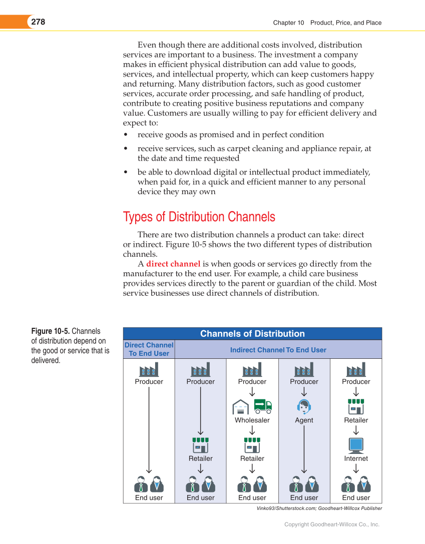 278 Chapter 10 Product, Price, and Place Copyright Goodheart-Willcox Co., Inc. Even though there are additional costs involved, distribution services are important to a business. The investment a company makes in efficient physical distribution can add value to goods, services, and intellectual property, which can keep customers happy and returning. Many distribution factors, such as good customer services, accurate order processing, and safe handling of product, contribute to creating positive business reputations and company value. Customers are usually willing to pay for efficient delivery and expect to: • receive goods as promised and in perfect condition • receive services, such as carpet cleaning and appliance repair, at the date and time requested • be able to download digital or intellectual product immediately, when paid for, in a quick and efficient manner to any personal device they may own Types of Distribution Channels There are two distribution channels a product can take: direct or indirect. Figure 10-5 shows the two different types of distribution channels. A direct channel is when goods or services go directly from the manufacturer to the end user. For example, a child care business provides services directly to the parent or guardian of the child. Most service businesses use direct channels of distribution. Figure 10-5. Channels of distribution depend on the good or service that is delivered. Channels of Distribution Direct Channel To End User Indirect Channel To End User Producer End user Producer Retailer Internet Producer Producer Producer Agent End user End user End user End user Wholesaler Retailer Retailer Vinko93/Shutterstock.com Goodheart-Willcox Publisher