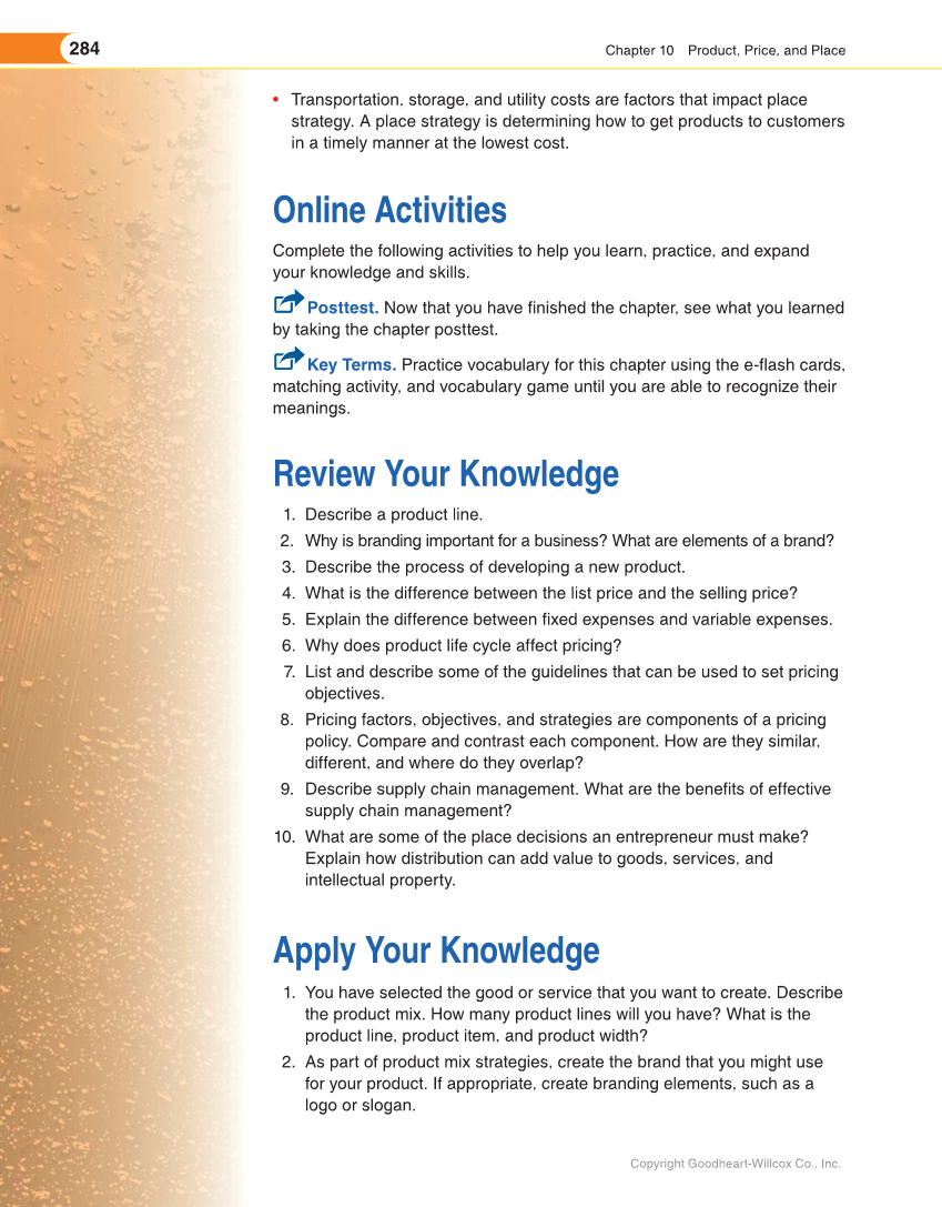 284 Chapter 10 Product, Price, and Place Copyright Goodheart-Willcox Co., Inc. • Transportation, storage, and utility costs are factors that impact place strategy. A place strategy is determining how to get products to customers in a timely manner at the lowest cost. Online Activities Complete the following activities to help you learn, practice, and expand your knowledge and skills. Posttest. Now that you have finished the chapter, see what you learned by taking the chapter posttest. Key Terms. Practice vocabulary for this chapter using the e-flash cards, matching activity, and vocabulary game until you are able to recognize their meanings. Review Your Knowledge 1. Describe a product line. 2. Why is branding important for a business? What are elements of a brand? 3. Describe the process of developing a new product. 4. What is the difference between the list price and the selling price? 5. Explain the difference between fixed expenses and variable expenses. 6. Why does product life cycle affect pricing? 7. List and describe some of the guidelines that can be used to set pricing objectives. 8. Pricing factors, objectives, and strategies are components of a pricing policy. Compare and contrast each component. How are they similar, different, and where do they overlap? 9. Describe supply chain management. What are the benefits of effective supply chain management? 10. What are some of the place decisions an entrepreneur must make? Explain how distribution can add value to goods, services, and intellectual property. Apply Your Knowledge 1. You have selected the good or service that you want to create. Describe the product mix. How many product lines will you have? What is the product line, product item, and product width? 2. As part of product mix strategies, create the brand that you might use for your product. If appropriate, create branding elements, such as a logo or slogan.