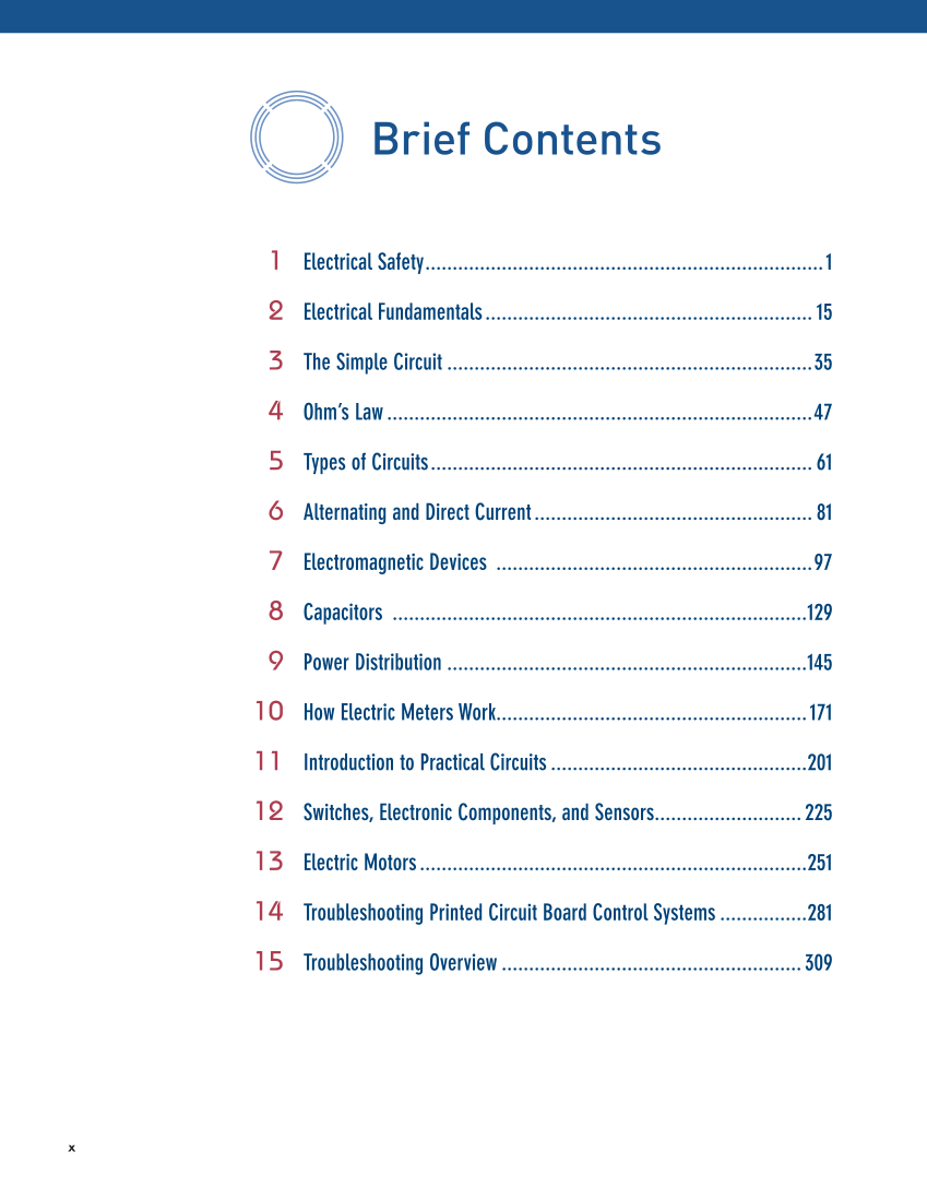 x Brief Contents 1 Electrical Safety .........................................................................1 2 Electrical Fundamentals ............................................................ 15 3 The Simple Circuit ...................................................................35 4 Ohm’s Law ..............................................................................47 5 Types of Circuits ...................................................................... 61 6 Alternating and Direct Current ................................................... 81 7 Electromagnetic Devices ..........................................................97 8 Capacitors ............................................................................129 9 Power Distribution ..................................................................145 10 How Electric Meters Work.........................................................171 11 Introduction to Practical Circuits ...............................................201 12 Switches, Electronic Components, and Sensors........................... 225 13 Electric Motors .......................................................................251 14 Troubleshooting Printed Circuit Board Control Systems ................281 15 Troubleshooting Overview ....................................................... 309