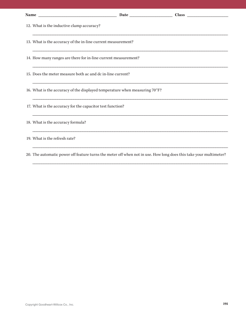 191 Copyright Goodheart-Willcox Co., Inc. Name __________________________________________ Date _______________________ Class ______________________ 12. What is the inductive clamp accuracy? ______________________________________________________________________________________________________________ 13. What is the accuracy of the in-line current measurement? ______________________________________________________________________________________________________________ 14. How many ranges are there for in-line current measurement? ______________________________________________________________________________________________________________ 15. Does the meter measure both ac and dc in-line current? ______________________________________________________________________________________________________________ 16. What is the accuracy of the displayed temperature when measuring 70°F? ______________________________________________________________________________________________________________ 17. What is the accuracy for the capacitor test function? ______________________________________________________________________________________________________________ 18. What is the accuracy formula? ______________________________________________________________________________________________________________ 19. What is the refresh rate? ______________________________________________________________________________________________________________ 20. The automatic power off feature turns the meter off when not in use. How long does this take your multimeter? ______________________________________________________________________________________________________________