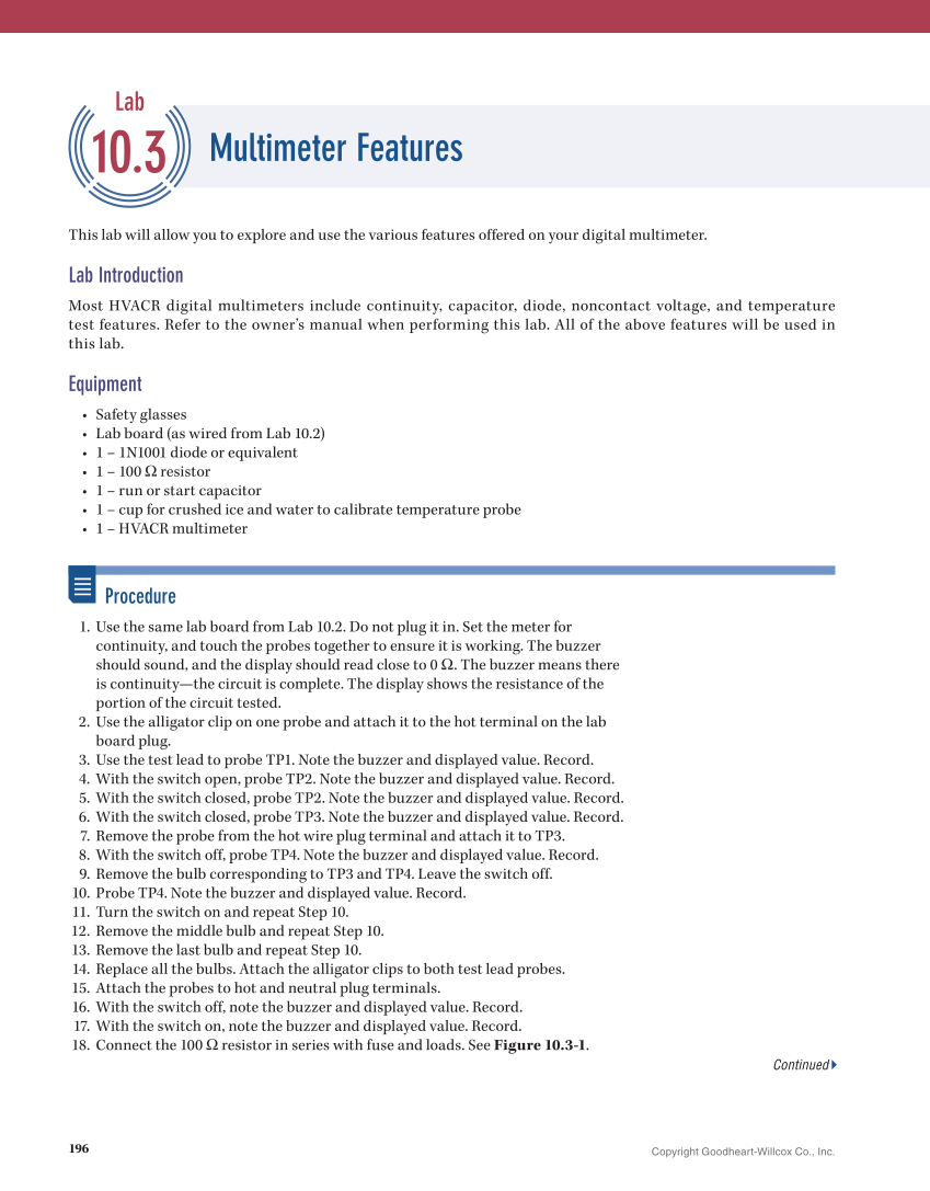 196 Copyright Goodheart-Willcox Co., Inc. This lab will allow you to explore and use the various features offered on your digital multimeter. Lab Introduction Most HVACR digital multimeters include continuity, capacitor, diode, noncontact voltage, and temperature test features. Refer to the owner’s manual when performing this lab. All of the above features will be used in this lab. Equipment • Safety glasses • Lab board (as wired from Lab 10.2) • 1 – 1N1001 diode or equivalent • 1 – 100 Ω resistor • 1 – run or start capacitor • 1 – cup for crushed ice and water to calibrate temperature probe • 1 – HVACR multimeter Procedure 1. Use the same lab board from Lab 10.2. Do not plug it in. Set the meter for continuity, and touch the probes together to ensure it is working. The buzzer should sound, and the display should read close to 0 Ω. The buzzer means there is continuity—the circuit is complete. The display shows the resistance of the portion of the circuit tested. 2. Use the alligator clip on one probe and attach it to the hot terminal on the lab board plug. 3. Use the test lead to probe TP1. Note the buzzer and displayed value. Record. 4. With the switch open, probe TP2. Note the buzzer and displayed value. Record. 5. With the switch closed, probe TP2. Note the buzzer and displayed value. Record. 6. With the switch closed, probe TP3. Note the buzzer and displayed value. Record. 7. Remove the probe from the hot wire plug terminal and attach it to TP3. 8. With the switch off, probe TP4. Note the buzzer and displayed value. Record. 9. Remove the bulb corresponding to TP3 and TP4. Leave the switch off. 10. Probe TP4. Note the buzzer and displayed value. Record. 11. Turn the switch on and repeat Step 10. 12. Remove the middle bulb and repeat Step 10. 13. Remove the last bulb and repeat Step 10. 14. Replace all the bulbs. Attach the alligator clips to both test lead probes. 15. Attach the probes to hot and neutral plug terminals. 16. With the switch off, note the buzzer and displayed value. Record. 17. With the switch on, note the buzzer and displayed value. Record. 18. Connect the 100 Ω resistor in series with fuse and loads. See Figure 10.3-1. Lab 10.3 Multimeter Features Continued