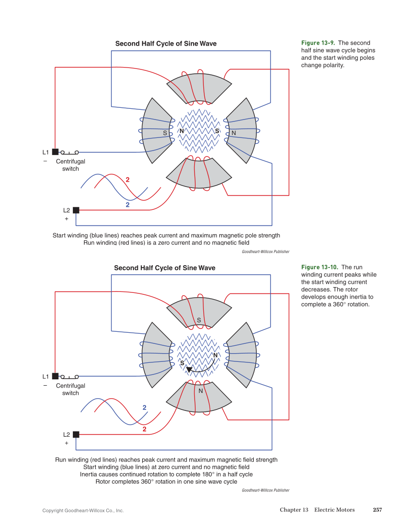 Copyright Goodheart-Willcox Co., Inc. Chapter 13 Electric Motors 257 2 2 N S – + L1 N L2 Centrifugal switch Start winding (blue lines) reaches peak current and maximum magnetic pole strength Run winding (red lines) is a zero current and no magnetic field Second Half Cycle of Sine Wave S Goodheart-Willcox Publisher Figure 13-9. The second half sine wave cycle begins and the start winding poles change polarity. 2 2 N S – + L1 S N L2 Centrifugal switch Run winding (red lines) reaches peak current and maximum magnetic field strength Start winding (blue lines) at zero current and no magnetic field Inertia causes continued rotation to complete 180° in a half cycle Rotor completes 360° rotation in one sine wave cycle Second Half Cycle of Sine Wave Goodheart-Willcox Publisher Figure 13-10. The run winding current peaks while the start winding current decreases. The rotor develops enough inertia to complete a 360° rotation.