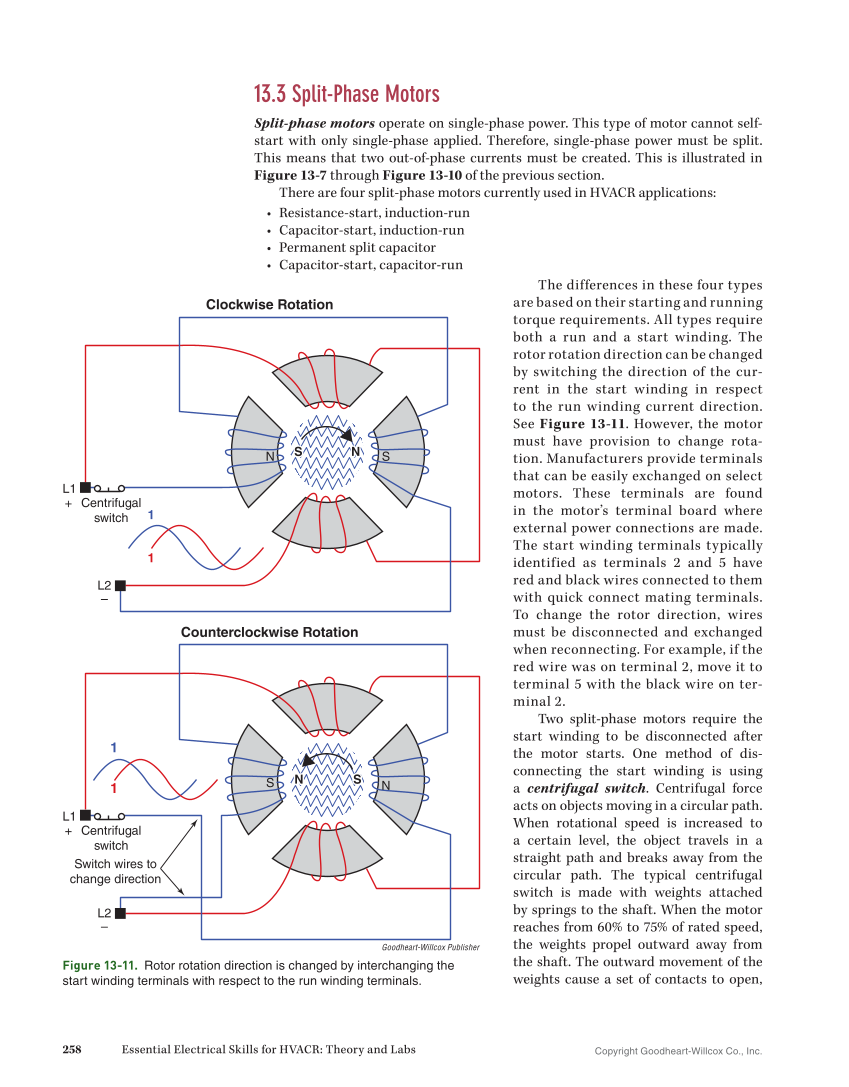 Copyright Goodheart-Willcox Co., Inc. 258 Essential Electrical Skills for HVACR: Theory and Labs 13.3 Split-Phase Motors Split-phase motors operate on single-phase power. This type of motor cannot self- start with only single-phase applied. Therefore, single-phase power must be split. This means that two out-of-phase currents must be created. This is illustrated in Figure 13-7 through Figure 13-10 of the previous section. There are four split-phase motors currently used in HVACR applications: • Resistance-start, induction-run • Capacitor-start, induction-run • Permanent split capacitor • Capacitor-start, capacitor-run The differences in these four types are based on their starting and running torque requirements. All types require both a run and a start winding. The rotor rotation direction can be changed by switching the direction of the cur- rent in the start winding in respect to the run winding current direction. See Figure 13-11. However, the motor must have provision to change rota- tion. Manufacturers provide terminals that can be easily exchanged on select motors. These terminals are found in the motor’s terminal board where external power connections are made. The start winding terminals typically identified as terminals 2 and 5 have red and black wires connected to them with quick connect mating terminals. To change the rotor direction, wires must be disconnected and exchanged when reconnecting. For example, if the red wire was on terminal 2, move it to terminal 5 with the black wire on ter- minal 2. Two split-phase motors require the start winding to be disconnected after the motor starts. One method of dis- connecting the start winding is using a centrifugal switch. Centrifugal force acts on objects moving in a circular path. When rotational speed is increased to a certain level, the object travels in a straight path and breaks away from the circular path. The typical centrifugal switch is made with weights attached by springs to the shaft. When the motor reaches from 60% to 75% of rated speed, the weights propel outward away from the shaft. The outward movement of the weights cause a set of contacts to open, 1 1 S N + – L1 S L2 Centrifugal switch Clockwise Rotation 1 1 N S + – L1 S N L2 Centrifugal switch Counterclockwise Rotation N Switch wires to change direction Goodheart-Willcox Publisher Figure 13-11. Rotor rotation direction is changed by interchanging the start winding terminals with respect to the run winding terminals.