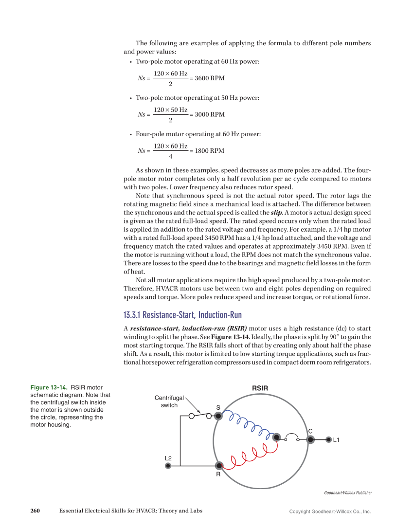 Copyright Goodheart-Willcox Co., Inc. 260 Essential Electrical Skills for HVACR: Theory and Labs The following are examples of applying the formula to different pole numbers and power values: • Two-pole motor operating at 60 Hz power: Ns = 120 × 60 Hz = 3600 RPM 2 • Two-pole motor operating at 50 Hz power: Ns = 120 × 50 Hz = 3000 RPM 2 • Four-pole motor operating at 60 Hz power: Ns = 120 × 60 Hz = 1800 RPM 4 As shown in these examples, speed decreases as more poles are added. The four- pole motor rotor completes only a half revolution per ac cycle compared to motors with two poles. Lower frequency also reduces rotor speed. Note that synchronous speed is not the actual rotor speed. The rotor lags the rotating magnetic field since a mechanical load is attached. The difference between the synchronous and the actual speed is called the slip. A motor’s actual design speed is given as the rated full-load speed. The rated speed occurs only when the rated load is applied in addition to the rated voltage and frequency. For example, a 1/4 hp motor with a rated full-load speed 3450 RPM has a 1/4 hp load attached, and the voltage and frequency match the rated values and operates at approximately 3450 RPM. Even if the motor is running without a load, the RPM does not match the synchronous value. There are losses to the speed due to the bearings and magnetic field losses in the form of heat. Not all motor applications require the high speed produced by a two-pole motor. Therefore, HVACR motors use between two and eight poles depending on required speeds and torque. More poles reduce speed and increase torque, or rotational force. 13.3.1 Resistance-Start, Induction-Run A resistance-start, induction-run (RSIR) motor uses a high resistance (dc) to start winding to split the phase. See Figure 13-14. Ideally, the phase is split by 90° to gain the most starting torque. The RSIR falls short of that by creating only about half the phase shift. As a result, this motor is limited to low starting torque applications, such as frac- tional horsepower refrigeration compressors used in compact dorm room refrigerators. S R L2 C L1 RSIR Centrifugal switch Goodheart-Willcox Publisher Figure 13-14. RSIR motor schematic diagram. Note that the centrifugal switch inside the motor is shown outside the circle, representing the motor housing.