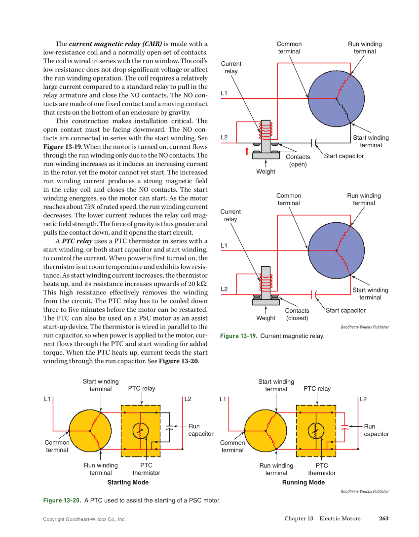 Copyright Goodheart-Willcox Co., Inc. Chapter 13 Electric Motors 263 The current magnetic relay (CMR) is made with a low-resistance coil and a normally open set of contacts. The coil is wired in series with the run window. The coil’s low resistance does not drop significant voltage or affect the run winding operation. The coil requires a relatively large current compared to a standard relay to pull in the relay armature and close the NO contacts. The NO con- tacts are made of one fixed contact and a moving contact that rests on the bottom of an enclosure by gravity. This construction makes installation critical. The open contact must be facing downward. The NO con- tacts are connected in series with the start winding. See Figure 13-19. When the motor is turned on, current flows through the run winding only due to the NO contacts. The run winding increases as it induces an increasing current in the rotor, yet the motor cannot yet start. The increased run winding current produces a strong magnetic field in the relay coil and closes the NO contacts. The start winding energizes, so the motor can start. As the motor reaches about 75% of rated speed, the run winding current decreases. The lower current reduces the relay coil mag- netic field strength. The force of gravity is thus greater and pulls the contact down, and it opens the start circuit. A PTC relay uses a PTC thermistor in series with a start winding, or both start capacitor and start winding, to control the current. When power is first turned on, the thermistor is at room temperature and exhibits low resis- tance. As start winding current increases, the thermistor heats up, and its resistance increases upwards of 20 kΩ. This high resistance effectively removes the winding from the circuit. The PTC relay has to be cooled down three to five minutes before the motor can be restarted. The PTC can also be used on a PSC motor as an assist start-up device. The thermistor is wired in parallel to the run capacitor, so when power is applied to the motor, cur- rent flows through the PTC and start winding for added torque. When the PTC heats up, current feeds the start winding through the run capacitor. See Figure 13-20. Goodheart-Willcox Publisher Figure 13-19. Current magnetic relay. Run winding terminal Start winding terminal Start capacitor Contacts (open) Weight Current relay Common terminal Common terminal L1 L2 L1 L2 Run winding terminal Start winding terminal Start capacitor Current relay Weight Contacts (closed) Starting Mode Start winding terminal Run winding terminal L1 L2 PTC thermistor PTC relay Run capacitor Common terminal Running Mode L1 Start winding terminal Run winding terminal L2 PTC thermistor PTC relay Run capacitor Common terminal Goodheart-Willcox Publisher Figure 13-20. A PTC used to assist the starting of a PSC motor.