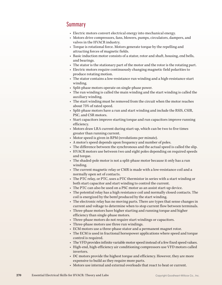 Copyright Goodheart-Willcox Co., Inc. 270 Essential Electrical Skills for HVACR: Theory and Labs Summary • Electric motors convert electrical energy into mechanical energy. • Motors drive compressors, fans, blowers, pumps, circulators, dampers, and valves in the HVACR industry. • Torque is rotational force. Motors generate torque by the repelling and attracting forces of magnetic fields. • Basic induction motor consists of a stator, rotor and shaft, housing, end bells, and bearings. • The stator is the stationary part of the motor and the rotor is the rotating part. • Electric motors require continuously changing magnetic field polarities to produce rotating motion. • The stator contains a low-resistance run winding and a high-resistance start winding. • Split-phase motors operate on single-phase power. • The run winding is called the main winding and the start winding is called the auxiliary winding. • The start winding must be removed from the circuit when the motor reaches about 75% of rated speed. • Split-phase motors have a run and start winding and include the RSIS, CSIR, PSC, and CSR motors. • Start capacitors improve starting torque and run capacitors improve running efficiency. • Motors draw LRA current during start-up, which can be two to five times greater than running current. • Motor speed is given in RPM (revolutions per minute). • A motor’s speed depends upon frequency and number of poles. • The difference between the synchronous and the actual speed is called the slip. • HVACR motors use between two and eight poles depending on required speeds and torque. • The shaded-pole motor is not a split-phase motor because it only has a run winding. • The current magnetic relay or CMR is made with a low-resistance coil and a normally open set of contacts. • The PTC relay, or PTC, uses a PTC thermistor in series with a start winding or both start capacitor and start winding to control the current. • The PTC can also be used on a PSC motor as an assist start-up device. • The potential relay has a high resistance coil and normally closed contacts. The coil is energized by the bemf produced by the start winding. • The electronic relay has no moving parts. There are types that sense changes in current and voltage to determine when to stop current flow between terminals. • Three-phase motors have higher starting and running torque and higher efficiency than single-phase motors. • Three-phase motors do not require start windings or capacitors. • Three-phase motors use three run windings. • ECM motors use a three-phase stator and a permanent magnet rotor. • The ECM is used in fractional horsepower applications where speed and torque control is required. • The VFD provides infinite variable motor speed instead of a few fixed speed values. • High-end, high-efficiency air conditioning compressors use VFD motors called inverters. • DC motors provide the highest torque and efficiency. However, they are more expensive to build as they require more parts. • Motors use internal and external overloads that react to heat or current.