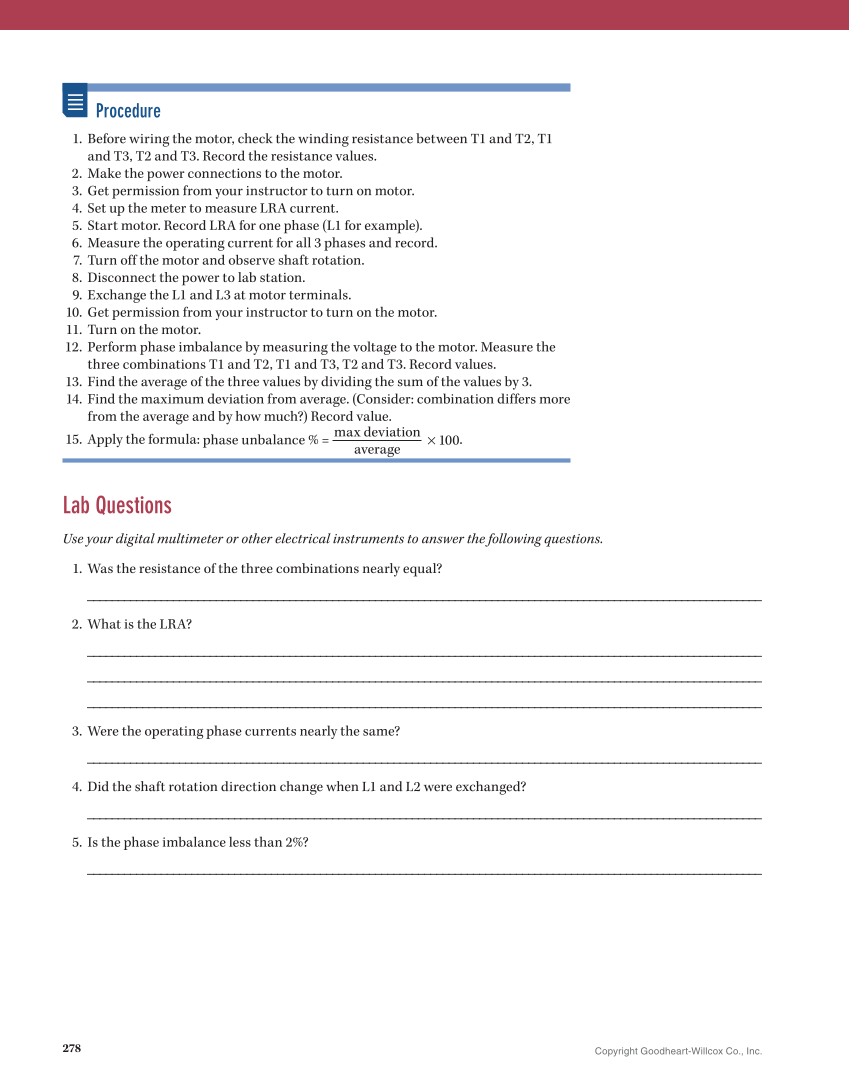 278 Copyright Goodheart-Willcox Co., Inc. Procedure 1. Before wiring the motor, check the winding resistance between T1 and T2, T1 and T3, T2 and T3. Record the resistance values. 2. Make the power connections to the motor. 3. Get permission from your instructor to turn on motor. 4. Set up the meter to measure LRA current. 5. Start motor. Record LRA for one phase (L1 for example). 6. Measure the operating current for all 3 phases and record. 7. Turn off the motor and observe shaft rotation. 8. Disconnect the power to lab station. 9. Exchange the L1 and L3 at motor terminals. 10. Get permission from your instructor to turn on the motor. 11. Turn on the motor. 12. Perform phase imbalance by measuring the voltage to the motor. Measure the three combinations T1 and T2, T1 and T3, T2 and T3. Record values. 13. Find the average of the three values by dividing the sum of the values by 3. 14. Find the maximum deviation from average. (Consider: combination differs more from the average and by how much?) Record value. 15. Apply the formula: phase unbalance % = max deviation × 100. average Lab Questions Use your digital multimeter or other electrical instruments to answer the following questions. 1. Was the resistance of the three combinations nearly equal? ______________________________________________________________________________________________________________ 2. What is the LRA? ______________________________________________________________________________________________________________ ______________________________________________________________________________________________________________ ______________________________________________________________________________________________________________ 3. Were the operating phase currents nearly the same? ______________________________________________________________________________________________________________ 4. Did the shaft rotation direction change when L1 and L2 were exchanged? ______________________________________________________________________________________________________________ 5. Is the phase imbalance less than 2%? ______________________________________________________________________________________________________________