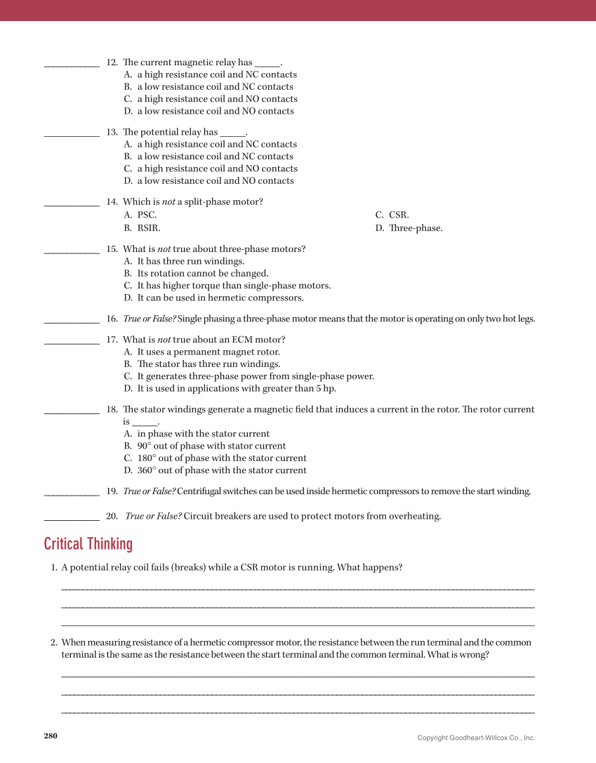 280 Copyright Goodheart-Willcox Co., Inc. ____________ 12. Th e current magnetic relay has _____. A. a high resistance coil and NC contacts B. a low resistance coil and NC contacts C. a high resistance coil and NO contacts D. a low resistance coil and NO contacts ____________ 13. Th e potential relay has _____. A. a high resistance coil and NC contacts B. a low resistance coil and NC contacts C. a high resistance coil and NO contacts D. a low resistance coil and NO contacts ____________ 14. Which is not a split-phase motor? A. PSC. B. RSIR. C. CSR. D. Th ree-phase. ____________ 15. What is not true about three-phase motors? A. It has three run windings. B. Its rotation cannot be changed. C. It has higher torque than single-phase motors. D. It can be used in hermetic compressors. ____________ 16. True or False? Single phasing a three-phase motor means that the motor is operating on only two hot legs. ____________ 17. What is not true about an ECM motor? A. It uses a permanent magnet rotor. B. Th e stator has three run windings. C. It generates three-phase power from single-phase power. D. It is used in applications with greater than 5 hp. ____________ 18. Th e stator windings generate a magnetic fi eld that induces a current in the rotor. Th e rotor current is _____. A. in phase with the stator current B. 90° out of phase with stator current C. 180° out of phase with the stator current D. 360° out of phase with the stator current ____________ 19. True or False? Centrifugal switches can be used inside hermetic compressors to remove the start winding. ____________ 20. True or False? Circuit breakers are used to protect motors from overheating. Critical Thinking 1. A potential relay coil fails (breaks) while a CSR motor is running. What happens? ______________________________________________________________________________________________________________ ______________________________________________________________________________________________________________ ______________________________________________________________________________________________________________ 2. When measuring resistance of a hermetic compressor motor, the resistance between the run terminal and the common terminal is the same as the resistance between the start terminal and the common terminal. What is wrong? ______________________________________________________________________________________________________________ ______________________________________________________________________________________________________________ ______________________________________________________________________________________________________________