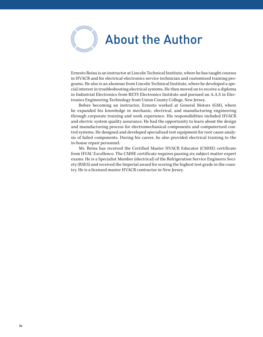 iv About the Author Ernesto Reina is an instructor at Lincoln Technical Institute, where he has taught courses in HVACR and for electrical-electronics service technician and customized training pro- grams. He also is an alumnus from Lincoln Technical Institute, where he developed a spe- cial interest in troubleshooting electrical systems. He then moved on to receive a diploma in Industrial Electronics from RETS Electronics Institute and pursued an A.A.S in Elec- tronics Engineering Technology from Union County College, New Jersey. Before becoming an instructor, Ernesto worked at General Motors (GM), where he expanded his knowledge in mechanic, electrical, and manufacturing engineering through corporate training and work experience. His responsibilities included HVACR and electric system quality assurance. He had the opportunity to learn about the design and manufacturing process for electromechanical components and computerized con- trol systems. He designed and developed specialized test equipment for root cause analy- sis of failed components. During his career, he also provided electrical training to the in-house repair personnel. Mr. Reina has received the Certified Master HVACR Educator (CMHE) certificate from HVAC Excellence. The CMHE certificate requires passing six subject matter expert exams. He is a Specialist Member (electrical) of the Refrigeration Service Engineers Soci- ety (RSES) and received the Imperial award for scoring the highest test grade in the coun- try. He is a licensed master HVACR contractor in New Jersey.