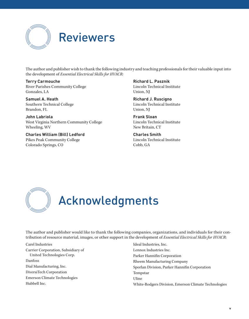 v Reviewers The author and publisher wish to thank the following industry and teaching professionals for their valuable input into the development of Essential Electrical Skills for HVACR: Acknowledgments The author and publisher would like to thank the following companies, organizations, and individuals for their con- tribution of resource material, images, or other support in the development of Essential Electrical Skills for HVACR: Terry Carmouche River Parishes Community College Gonzales, LA Samuel A. Heath Southern Technical College Brandon, FL John Labriola West Virginia Northern Community College Wheeling, WV Charles William (Bill) Ledford Pikes Peak Community College Colorado Springs, CO Richard L. Pasznik Lincoln Technical Institute Union, NJ Richard J. Ruscigno Lincoln Technical Institute Union, NJ Frank Sloan Lincoln Technical Institute New Britain, CT Charles Smith Lincoln Technical Institute Cobb, GA Carel Industries Carrier Corporation, Subsidiary of United Technologies Corp. Danfoss Dial Manufacturing, Inc. DiversiTech Corporation Emerson Climate Technologies Hubbell Inc. Ideal Industries, Inc. Lennox Industries Inc. Parker Hannifin Corporation Rheem Manufacturing Company Sporlan Division, Parker Hannifi n Corporation Tempstar Uline White-Rodgers Division, Emerson Climate Technologies