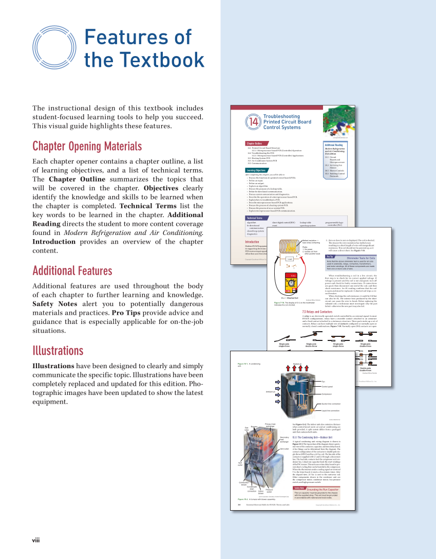 viii The instructional design of this textbook includes student-focused learning tools to help you succeed. This visual guide highlights these features. Chapter Opening Materials Each chapter opener contains a chapter outline, a list of learning objectives, and a list of technical terms. The Chapter Outline summarizes the topics that will be covered in the chapter. Objectives clearly identify the knowledge and skills to be learned when the chapter is completed. Technical Terms list the key words to be learned in the chapter. Additional Reading directs the student to more content coverage found in Modern Refrigeration and Air Conditioning. Introduction provides an overview of the chapter content. Additional Features Additional features are used throughout the body of each chapter to further learning and knowledge. Safety Notes alert you to potentially dangerous materials and practices. Pro Tips provide advice and guidance that is especially applicable for on-the-job situations. Illustrations Illustrations have been designed to clearly and simply communicate the specific topic. Illustrations have been completely replaced and updated for this edition. Pho- tographic images have been updated to show the latest equipment. Features of the Textbook Copyright Goodheart-Willcox Co., Inc. 281 algorithm bi-directional communication closed-loop system diagnostics direct digital control (DDC) event input integrated furnace controller (IFC) lookup table open-loop system output printed circuit board (PCB) programmable logic controller (PLC) signall trace varistor Technical Terms 14 Troubleshooting Printed Circuit Board Control Systems 14.1 Printed Circuit Board Structure 14.1.1 Microprocessor-based PCB (Controller) Operation 14.2 Troubleshooting the PCB 14.2.1 Microprocessor-based PCB (Controller) Applications 14.3 Heating System PCB 14.4 Air Conditioner System PCB 14.5 Communication After completing this chapter, you will be able to: • Discuss the function of a printed circuit board (PCB). • Define an input. • Define an output. • Explain an algorithm. • Discuss the purpose of a lookup table. • Define bi-directional communication. • Discuss system annunciation and diagnostics. • Describe the operation of a microprocessor-based PCB. • Explain how to troubleshoot a PCB. • Describe microprocessor-based PCB applications. • Discuss the process of a heating system PCB. • Discuss the process of an ac system PCB. • Explain microprocessor-based PCB communication. Chapter Outline Learning Objectives Additional Reading Modern Refrigeration and Air Conditioning, 21st edition 14.3 Circuit Boards and Microprocessors 18.3 Servicing Fan Motors 38.5 Blower Controls 45.5 Building Control Protocols Introduction Modern HVACR equipment uses microprocessor-based controls. The microprocessor and its supporting electronic are mounted on a printed circuit board (PCB). A PCB receives input signals from system sensors and switches. The microprocessor’s algo- rithm then uses this information to produce output signals to control an HVACR system. cosmopolit/Shutterstock.com , n ccomponents s rm Copyright Co., Inc. 108 Theory 3. Zero or close to zero is displayed. The coil is shorted. This means the wire insulation has melted away resulting in a short length of wire with insignificant resistance. This coil should not be powered up, as it will cause a direct short. See Figure 7-18. When troubleshooting a coil in a live circuit, the first step is to check for its correct applied voltage. If voltage is present and the coil is not energized, turn off power and check for faulty connections. If connections are good, then disconnect one end of the coil, and then check resistance. An OL reading confirms that the coil is open and must be replaced. A shorted coil trips a cir- cuit breaker. When checking the coil resistance, it could be 0 Ω but can also be OL. The intense heat produced by the short circuit can cause the wire to break. Before replacing the solenoid coil, a technician must investigate why the part failed—otherwise the new part may also fail. 7.3 Relays and Contactors A relay is an electrically operated switch controlled by an external signal. In most HVACR configurations, relays have a movable contact attached to an armature and a fixed contact attached to a stationary structure. These parts make up a set of contacts. Relays can have multiple sets of contacts configured as normally open or normally closed combinations, Figure 7-19. Normally open (NO) contacts are open Ohmmeter Tests for Coils Note that the above ohmmeter test is used for all coils used in solenoids, relays, contactors, transformers, and motor windings. All of these components are made from one or more coils of wire. Pro Tip Melted insulation — bare wires contacting Rules No 2. Isolate coil Load 1 2 0.0Ω VΩ com A Ω V V 0 Ω — Shorted Coil Goodheart-Willcox Publisher Figure 7-18. The display of 0 Ω on the multimeter indicates the coil shorted. Single-pole single-throw Single-pole single-throw Single-pole double-throw Single-pole double-throw Double-pole double-throw Double-polee single-throww Goodheart-Willcox Publisher Figure 7-19. Cop right GGoodheart-Willcox 1 8 EEssentiall sse tia EElectricall lec rica SSkillsls k l fforr HHVACR:: V CR Th ory aandd LLabssb DDouble-poleleope-blou doubdouble-throwrow-thel pol si DDouble-pole ouble-pole ssingle-throw ing re 7- 9. CContactt o tac cconfigurations..snoitaruginfo Copyright Goodheart-Willcox Co., Inc. 310 Essential Electrical Skills for HVACR: Theory and Labs See Figure 15-2. The indoor unit also contains a furnace when central forced warm air and air conditioning are both provided. A split system differs from a packaged unit that contains both units. 15.1.1 The Condensing Unit—Outdoor Unit A typical condensing unit wiring diagram is shown in Figure 15-3. The top section of the diagram shows a picto- rial view of the contactor, capacitor, and time delay board. A few things can 