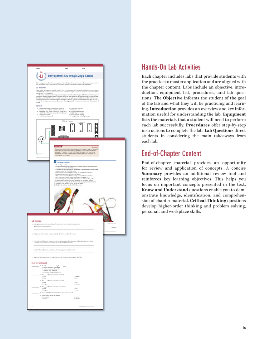 ix Hands-On Lab Activities Each chapter includes labs that provide students with the practice to master application and are aligned with the chapter content. Labs include an objective, intro- duction, equipment list, procedures, and lab ques- tions. The Objective informs the student of the goal of the lab and what they will be practicing and learn- ing. Introduction provides an overview and key infor- mation useful for understanding the lab. Equipment lists the materials that a student will need to perform each lab successfully. Procedures offer step-by-step instructions to complete the lab. Lab Questions direct students in considering the main takeaways from each lab. End-of-Chapter Content End-of-chapter material provides an opportunity for review and application of concepts. A concise Summary provides an additional review tool and reinforces key learning objectives. This helps you focus on important concepts presented in the text. Know and Understand questions enable you to dem- onstrate knowledge, identification, and comprehen- sion of chapter material. Critical Thinking questions develop higher-order thinking and problem solving, personal, and workplace skills. 53 Copyright Goodheart-Willcox Co., Inc. Name __________________________________________ Date _______________________ Class ______________________ This multi-part lab will use hands-on application to build upon the lessons learned in this chapter. Its purpose is to give you practice in verifying Ohm’s law calculations by using a power source, loads, and a multimeter. Lab Introduction There will be three parts to this lab. This first part will use a battery and two different value resistors to compare calculated values to measured values. Since most HVACR meters only measure dc microamperes, large value resistors must be used with a 9 V battery. The second part includes observing and evaluating measured values. The third part of this lab uses 24 Vac and power resistors to compare calculated values to measured values. The 24 Vac allows for the use of an ac inductive clamp ammeter. Both the second and third lab will use a step-down transformer to supply approximately 24 Vac, which is called the second- ary voltage. This secondary voltage is a reduced voltage that is produced when the step-down transformer plugs into a 120 V. Use the lab diagrams to construct the circuits. The equipment below contains the materials for all three parts of the lab. Equipment • 1—Digital multimeter with clamp-on ammeter • Lab board. See Lab 3.2 for complete instructions. • 1—100,000 Ω 1/4 W resistor (no less than 5% tolerance) • 1—200,000 Ω 1/4 W resistor (no less than 5% tolerance) • 1—9 V dry cell battery • 2—60 W incandescent bulb • 16 or 14 AWG solid wire • 14 AWG wire nuts • 14 AWG spade terminals • 25 Ω 25 W power resistor • 50 Ω 25 W power resistor • 2—jumper wires with alligator clips Lab 4.1 Verifying Ohm’s Law through Simple Circuits Goodheart-Willcox Publisher Step-down transformer Bulb socket Terminal block Fuse 2 × 4 switch box Pictorial Diagram Figure 4.1-1. , 54 Copyright Goodheart-Willcox Co., Inc. Resistors Resistors are rated by ohmic value, tolerance, and wattage. A 10 Ω, 1/4 W resistor burns if 6 V are applied because the current 0.6 A (6 V/10 Ω) multiplied by the voltage of 6 V results in 3.6 W. A 1/4 W (0.250 W) resistor is too small for the application. The correct wattage resistor must be used by first calculating the resistor power consumption. Safety Note Procedure—Part One 1. Review Figure 4.1-2. 2. Connect one jumper end to the positive terminal of the battery and the other end to one end of the 100,000 Ω resistor. 3. Connect a second jumper to the negative end of the battery and the end to the opposite end of the 100,000 Ω resistor. 4. Measure and record the battery voltage (after resistor is connected). 5. Connect the 200,000 Ω resistor to the battery. 6. Measure and record the battery voltage (after resistor is connected). 7. Rewire circuit to include ammeter in circuit. See Figure 4.1-3. 8. Connect jumper to positive battery terminal and meter positive probe. 9. Connect jumper to negative meter probe and any one side of resistor. 10. Connect jumper to opposite side of resistor and to the negative battery terminal. 11. Complete Lab Questions for the 100,000 Ω resistor. 12. Replace the resistor with the 200,000 Ω resistor. Goodheart-Willcox Publisher Figure 4.1-2.. Goodheart-Willcox Publisher Figure 4.1-3.. Continued Cop ight G cox Fig 2 F 3 58 Copyright Goodheart-Willcox Co., Inc. Lab Questions Use your digital multimeter or other electrical instruments to answer the following questions. 1. What is the secondary voltage? ______________________________________________________________________________________________________________ ______________________________________________________________________________________________________________ 2. Using the actual secondary voltage and the 25 Ω resistor, calculate the current. ______________________________________________________________________________________________________________ ______________________________________________________________________________________________________________ 3. With only the 25 Ω resistor connected to the secondary, plug in the transformer and use the inductance clamp ammeter to measure the actual current draw of the resistor. Record value. ______________________________________________________________________________________________________________ ______________________________________________________________________________________________________________ 4. Are the calculated and measured values of current approximately the same? ______________________________________________________________________________________________________________ ______________________________________________________________________________________________________________ 5. Repeat the above steps using 