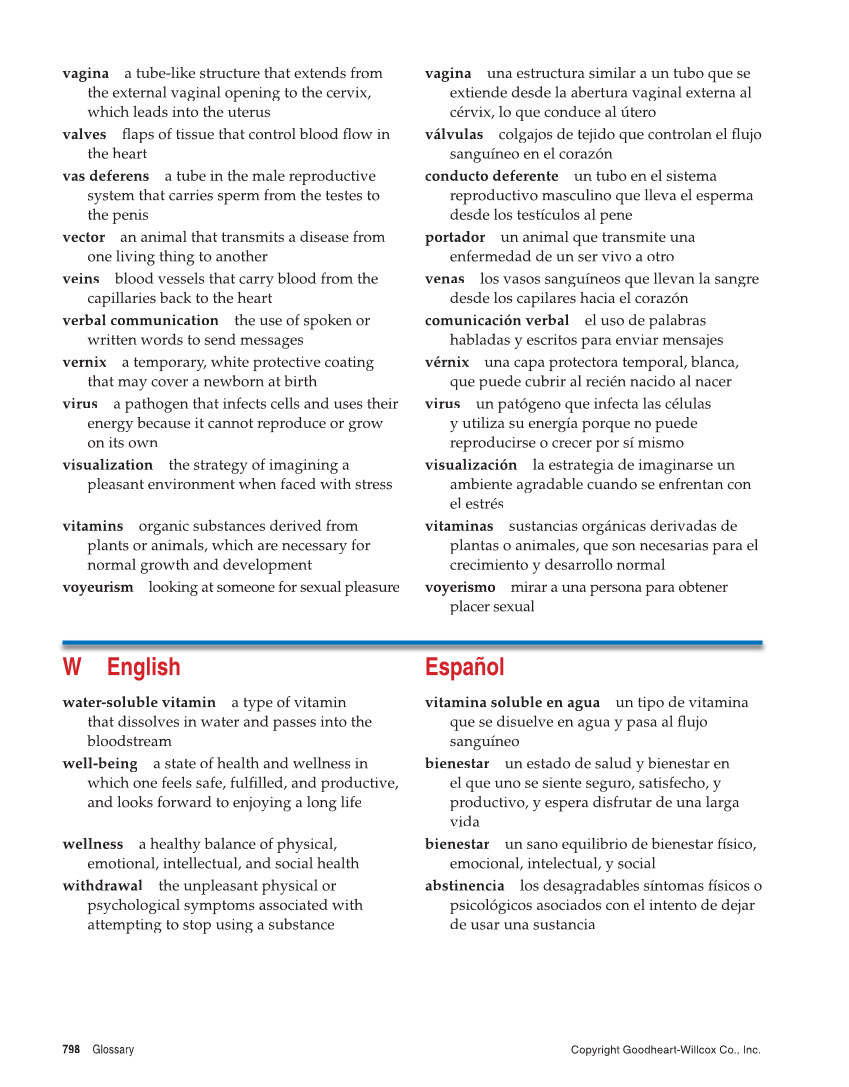 798 Glossary Copyright Goodheart-Willcox Co., Inc. vagina una estructura similar a un tubo que se extiende desde la abertura vaginal externa al cérvix, lo que conduce al útero válvulas colgajos de tejido que controlan el fl ujo fl sanguíneo en el corazón conducto deferente un tubo en el sistema reproductivo masculino que lleva el esperma desde los testículos al pene portador un animal que transmite una enfermedad de un ser vivo a otro venas los vasos sanguíneos que llevan la sangre desde los capilares hacia el corazón comunicación verbal el uso de palabras habladas y escritos para enviar mensajes vérnix una capa protectora temporal, blanca, que puede cubrir al recién nacido al nacer virus un patógeno que infecta las células y utiliza su energía porque no puede reproducirse o crecer por sí mismo visualización la estrategia de imaginarse un ambiente agradable cuando se enfrentan con el estrés vitaminas sustancias orgánicas derivadas de plantas o animales, que son necesarias para el crecimiento y desarrollo normal voyerismo mirar a una persona para obtener placer sexual Español vitamina soluble en agua un tipo de vitamina que se disuelve en agua y pasa al fl ujo fl sanguíneo bienestar un estado de salud y bienestar en el que uno se siente seguro, satisfecho, y productivo, y espera disfrutar de una larga vida bienestar un sano equilibrio de bienestar físico, r emocional, intelectual, y social abstinencia los desagradables síntomas físicos o psicológicos asociados con el intento de dejar de usar una sustancia vagina a tube-like structure that extends from the external vaginal opening to the cervix, which leads into the uterus valves fl aps of tissue that control blood flow fl in fl the heart vas deferens a tube in the male reproductive system that carries sperm from the testes to the penis vector an animal that transmits a disease from one living thing to another veins blood vessels that carry blood from the capillaries back to the heart verbal communication the use of spoken or written words to send messages vernix a temporary, white protective coating that may cover a newborn at birth virus a pathogen that infects cells and uses their energy because it cannot reproduce or grow on its own visualization the strategy of imagining a pleasant environment when faced with stress vitamins organic substances derived from plants or animals, which are necessary for normal growth and development voyeurism looking at someone for sexual pleasure W English water-soluble vitamin a type of vitamin that dissolves in water and passes into the bloodstream well-being a state of health and wellness in which one feels safe, fulfi and productive, filled, and looks forward to enjoying a long life wellness a healthy balance of physical, emotional, intellectual, and social health withdrawal the unpleasant physical or psychological symptoms associated with attempting to stop using a substance