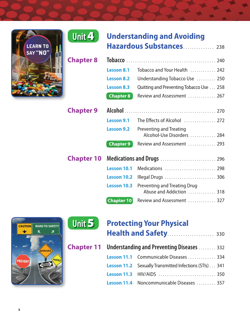 x Unit 4 Understanding and Avoiding Hazardous Substances . . . . . . . . . . . . . . 238 Chapter 8 Tobacco . . . . . . . . . . . . . . . . . . . . . . . . . . . . . . . . . . . . . . . . . . 240 Lesson 8.1 Tobacco and Your Health . . . . . . . . . . . . 242 Lesson 8.2 Understanding Tobacco Use . . . . . . . . . 250 Lesson 8.3 Quitting and Preventing Tobacco Use . . . 258 Chapter 8 Review and Assessment . . . . . . . . . . . . . 267 Chapter 9 Alcohol . . . . . . . . . . . . . . . . . . . . . . . . . . . . . . . . . . . . . . . . . . . 270 Lesson 9.1 The Effects of Alcohol . . . . . . . . . . . . . . . 272 Lesson 9.2 Preventing and Treating Alcohol-Use Disorders . . . . . . . . . . . . 284 Chapter 9 Review and Assessment . . . . . . . . . . . . . 293 Chapter 10 Medications and Drugs . . . . . . . . . . . . . . . . . . . . . . . . . . 296 Lesson 10.1 Medications . . . . . . . . . . . . . . . . . . . . . . . . 298 Lesson 10.2 Illegal Drugs . . . . . . . . . . . . . . . . . . . . . . . . 306 Lesson 10.3 Preventing and Treating Drug Abuse and Addiction . . . . . . . . . . . . . 318 Chapter 10 Review and Assessment . . . . . . . . . . . . . 327 Unit 5 Protecting Your Physical Health and Safety . . . . . . . . . . . . . . . . . . . . . 330 Chapter 11 Understanding and Preventing Diseases . . . . . . . . 332 Lesson 11.1 Communicable Diseases . . . . . . . . . . . . . 334 Lesson 11.2 Sexually Transmitted Infections (STIs) . . . 341 Lesson 11.3 HIV/AIDS . . . . . . . . . . . . . . . . . . . . . . . . . . . 350 Lesson 11.4 Noncommunicable Diseases . . . . . . . . . 357