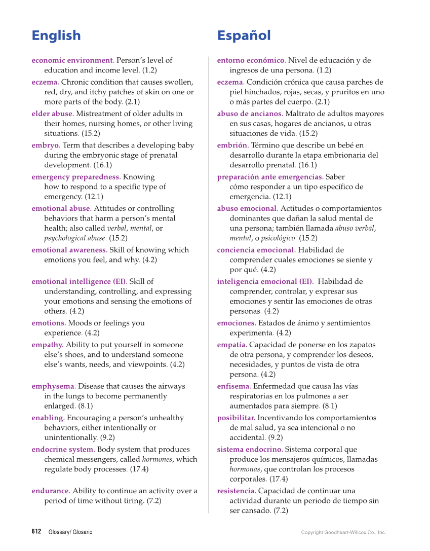 English Español Glossary/ Glosario Copyright Goodheart-Willcox Co., Inc. 612 economic environment. Person’s level of education and income level. (1.2) entorno económico. Nivel de educación y de ingresos de una persona. (1.2) eczema. Chronic condition that causes swollen, red, dry, and itchy patches of skin on one or more parts of the body. (2.1) eczema. Condición crónica que causa parches de piel hinchados, rojas, secas, y pruritos en uno o más partes del cuerpo. (2.1) elder abuse. Mistreatment of older adults in their homes, nursing homes, or other living situations. (15.2) abuso de ancianos. Maltrato de adultos mayores en sus casas, hogares de ancianos, u otras situaciones de vida. (15.2) embryo. Term that describes a developing baby during the embryonic stage of prenatal development. (16.1) embrión. Término que describe un bebé en desarrollo durante la etapa embrionaria del desarrollo prenatal. (16.1) emergency preparedness. Knowing how to respond to a specific type of emergency. (12.1) preparación ante emergencias. Saber cómo responder a un tipo específico de emergencia. (12.1) emotional abuse. Attitudes or controlling behaviors that harm a person’s mental health also called verbal, mental, or psychological abuse. (15.2) abuso emocional. Actitudes o comportamientos dominantes que dañan la salud mental de una persona también llamada abuso verbal, mental, o psicológico. (15.2) emotional awareness. Skill of knowing which emotions you feel, and why. (4.2) conciencia emocional. Habilidad de comprender cuales emociones se siente y por qué. (4.2) emotional intelligence (EI). Skill of understanding, controlling, and expressing your emotions and sensing the emotions of others. (4.2) inteligencia emocional (EI). Habilidad de comprender, controlar, y expresar sus emociones y sentir las emociones de otras personas. (4.2) emotions. Moods or feelings you experience. (4.2) emociones. Estados de ánimo y sentimientos experimenta. (4.2) empathy. Ability to put yourself in someone else’s shoes, and to understand someone else’s wants, needs, and viewpoints. (4.2) empatía. Capacidad de ponerse en los zapatos de otra persona, y comprender los deseos, necesidades, y puntos de vista de otra persona. (4.2) emphysema. Disease that causes the airways in the lungs to become permanently enlarged. (8.1) enfisema. Enfermedad que causa las vías respiratorias en los pulmones a ser aumentados para siempre. (8.1) enabling. Encouraging a person’s unhealthy behaviors, either intentionally or unintentionally. (9.2) posibilitar. Incentivando los comportamientos de mal salud, ya sea intencional o no accidental. (9.2) endocrine system. Body system that produces chemical messengers, called hormones, which regulate body processes. (17.4) sistema endocrino. Sistema corporal que produce los mensajeros químicos, llamadas hormonas, que controlan los procesos corporales. (17.4) endurance. Ability to continue an activity over a period of time without tiring. (7.2) resistencia. Capacidad de continuar una actividad durante un periodo de tiempo sin ser cansado. (7.2)