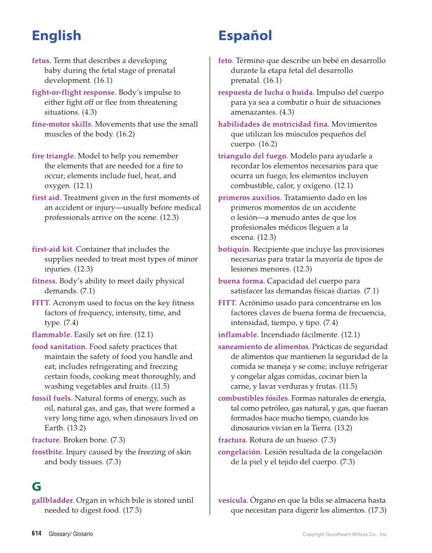 English Español Glossary/ Glosario Copyright Goodheart-Willcox Co., Inc. 614 fetus. Term that describes a developing baby during the fetal stage of prenatal development. (16.1) feto. Término que describe un bebé en desarrollo durante la etapa fetal del desarrollo prenatal. (16.1) fight-or-flight response. Body’s impulse to either fight off or flee from threatening situations. (4.3) respuesta de lucha o huida. Impulso del cuerpo para ya sea a combatir o huir de situaciones amenazantes. (4.3) fine-motor skills. Movements that use the small muscles of the body. (16.2) habilidades de motricidad fina. Movimientos que utilizan los músculos pequeños del cuerpo. (16.2) fire triangle. Model to help you remember the elements that are needed for a fire to occur elements include fuel, heat, and oxygen. (12.1) triangulo del fuego. Modelo para ayudarle a recordar los elementos necesarios para que ocurra un fuego los elementos incluyen combustible, calor, y oxígeno. (12.1) first aid. Treatment given in the first moments of an accident or injury—usually before medical professionals arrive on the scene. (12.3) primeros auxilios. Tratamiento dado en los primeros momentos de un accidente o lesión—a menudo antes de que los profesionales médicos lleguen a la escena. (12.3) first-aid kit. Container that includes the supplies needed to treat most types of minor injuries. (12.3) botiquín. Recipiente que incluye las provisiones necesarias para tratar la mayoría de tipos de lesiones menores. (12.3) fitness. Body’s ability to meet daily physical demands. (7.1) buena forma. Capacidad del cuerpo para satisfacer las demandas físicas diarias. (7.1) FITT. Acronym used to focus on the key fitness factors of frequency, intensity, time, and type. (7.4) FITT. Acrónimo usado para concentrarse en los factores claves de buena forma de frecuencia, intensidad, tiempo, y tipo. (7.4) flammable. Easily set on fire. (12.1) inflamable. Incendiado fácilmente. (12.1) food sanitation. Food safety practices that maintain the safety of food you handle and eat includes refrigerating and freezing certain foods, cooking meat thoroughly, and washing vegetables and fruits. (11.5) saneamiento de alimentos. Prácticas de seguridad de alimentos que mantienen la seguridad de la comida se maneja y se come incluye refrigerar y congelar algas comidas, cocinar bien la carne, y lavar verduras y frutas. (11.5) fossil fuels. Natural forms of energy, such as oil, natural gas, and gas, that were formed a very long time ago, when dinosaurs lived on Earth. (13.2) combustibles fósiles. Formas naturales de energía, tal como petróleo, gas natural, y gas, que fueran formados hace mucho tiempo, cuando los dinosaurios vivían en la Tierra. (13.2) fracture. Broken bone. (7.3) fractura. Rotura de un hueso. (7.3) frostbite. Injury caused by the freezing of skin and body tissues. (7.3) congelación. Lesión resultada de la congelación de la piel y el tejido del cuerpo. (7.3) G gallbladder. Organ in which bile is stored until needed to digest food. (17.3) vesícula. Órgano en que la bilis se almacena hasta que necesitan para digerir los alimentos. (17.3)